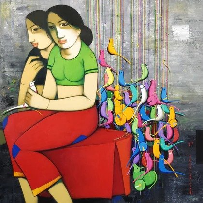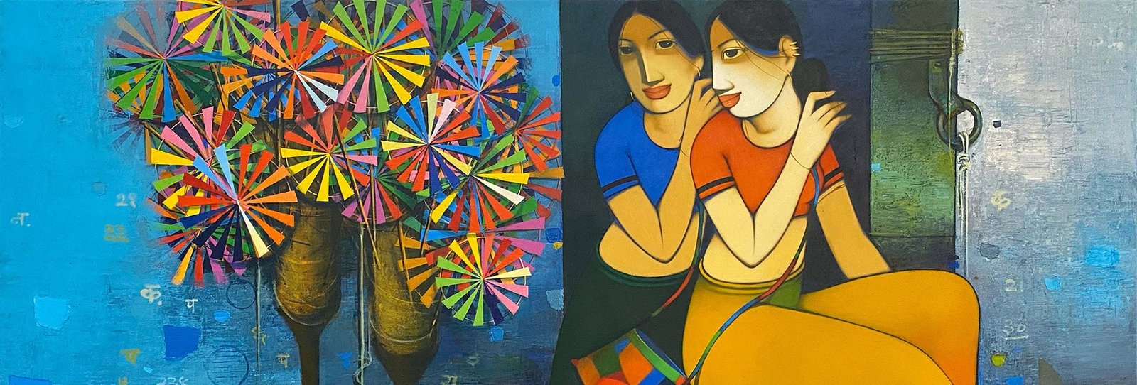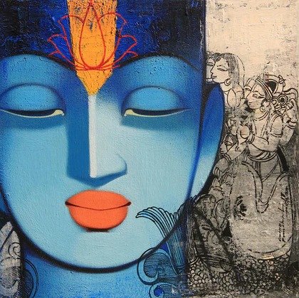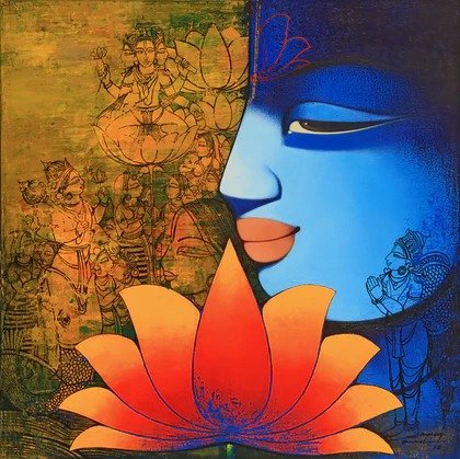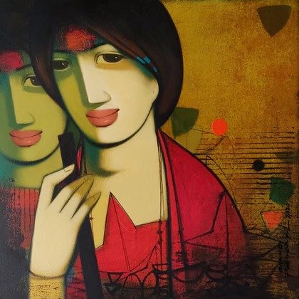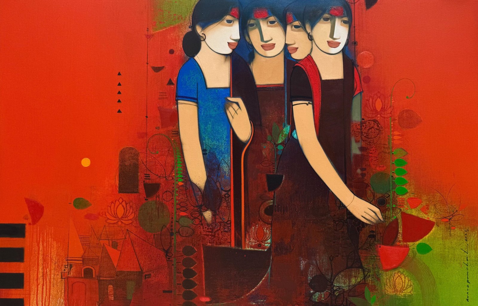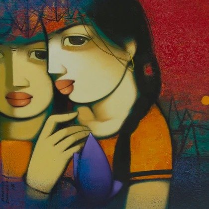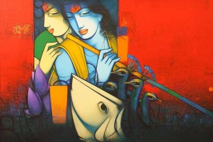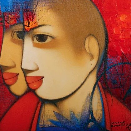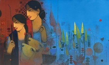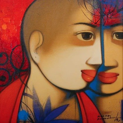 Beauty, boldness, brightness and gorgeousness are some of the trademarks of Anand Panchal’s works. Best known for his figurative artworks, Panchal has over the years developed an unique style of his own, mostly paints Brahmins, and children with lots of innocence in them. Panchal’s paintings are quite narrative, showing the unfolding stories of rural life. In most of his paintings we see the figures enjoying each other’s company. Backgrounds merge with the subject of the painting, one can observe the scripts in the background; animals and birds; group figures, and also painted singularly. Application of colours is smooth and well finished. The colour palette is restricted to reds, blues and oranges. Foreheads are painted with orange or blue, to show the mood. Orange symbolizes spirituality and blue symbolizes calmness and peacefulness. Panchal has painted many panel format works.