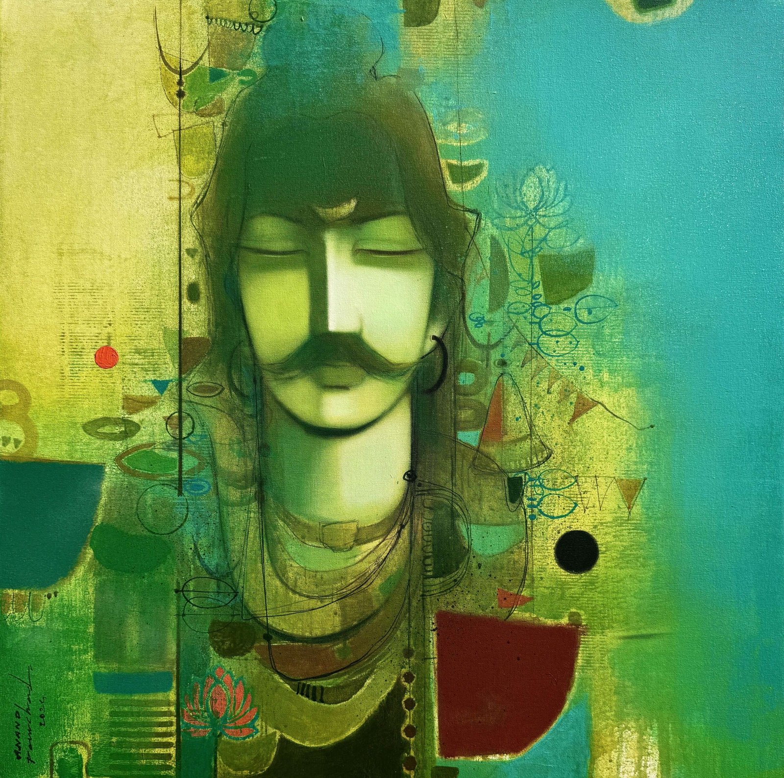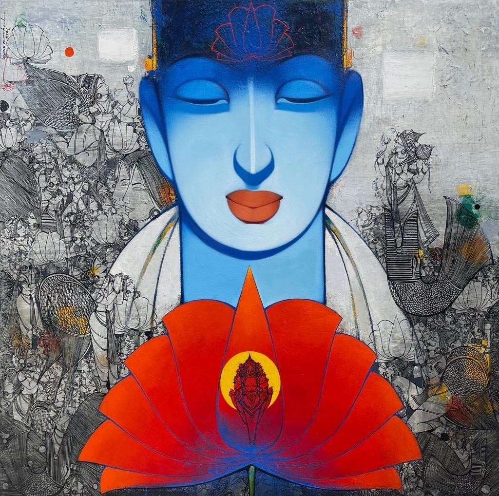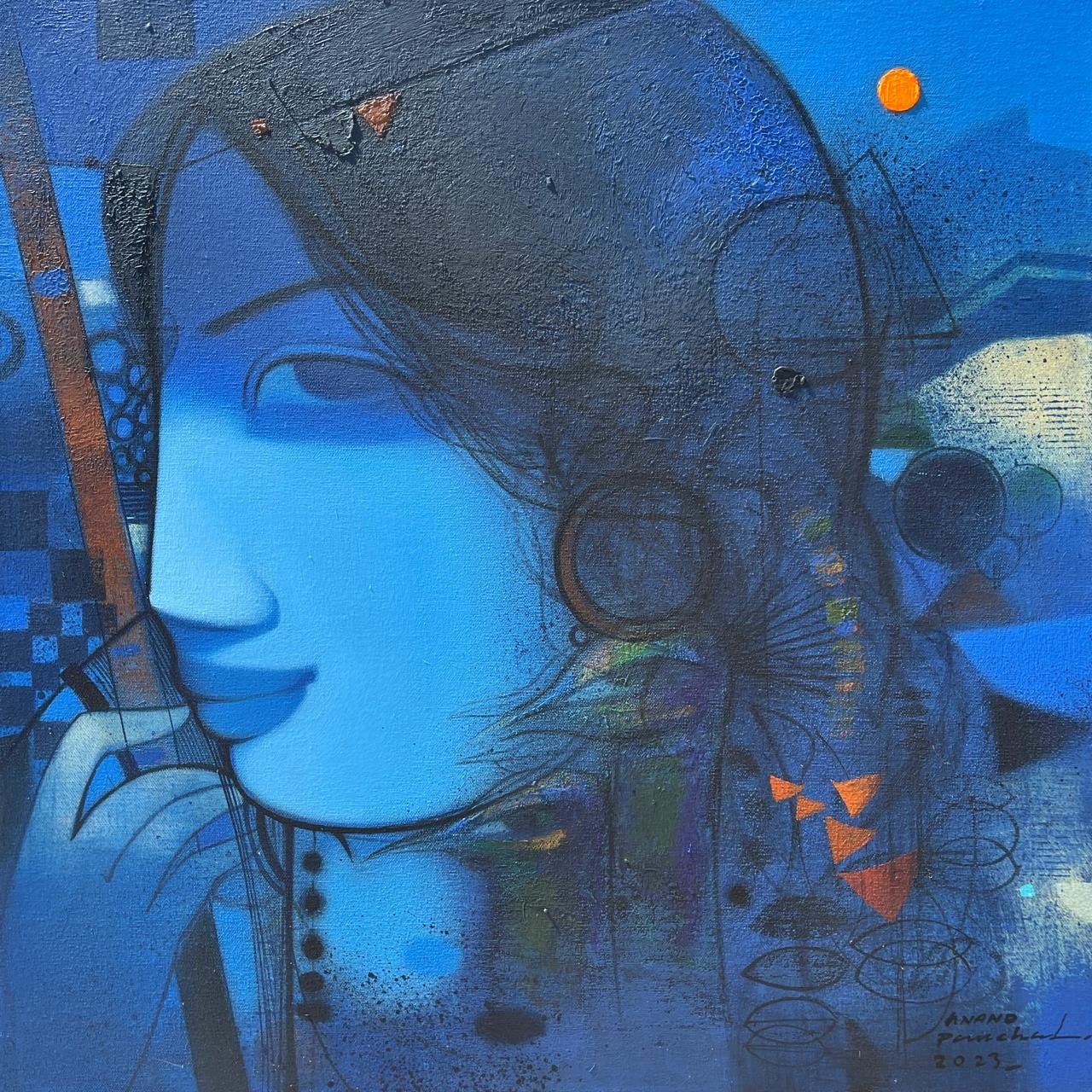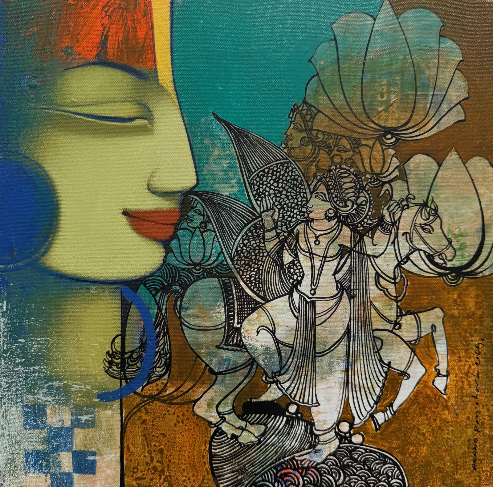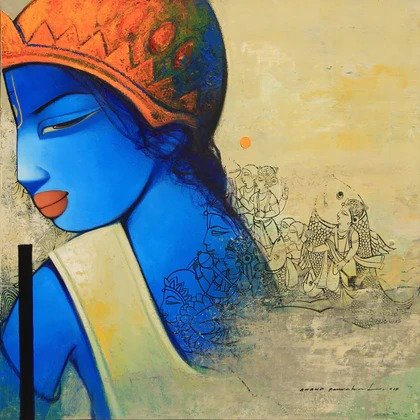 Artist, Anand Panchal, Born on October 11, 1973 in Latur, Maharashtra. His works are in collection with many art lovers in India and abroad. Best known for his figurative artworks. He has developed a unique style of his own. He mostly paints children – capturing their innocence, animals and Brahmins in vibrant colours, which symbolizes calmness, peacefulness and spirituality.
