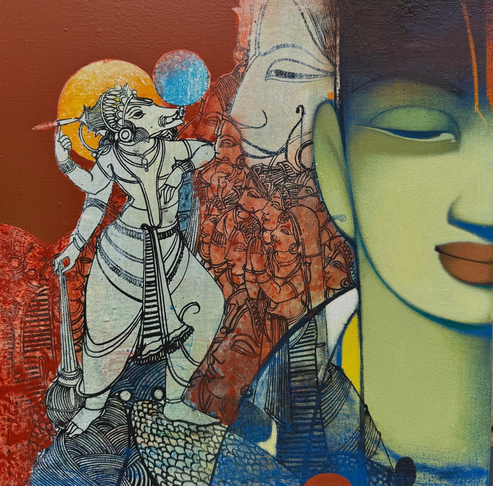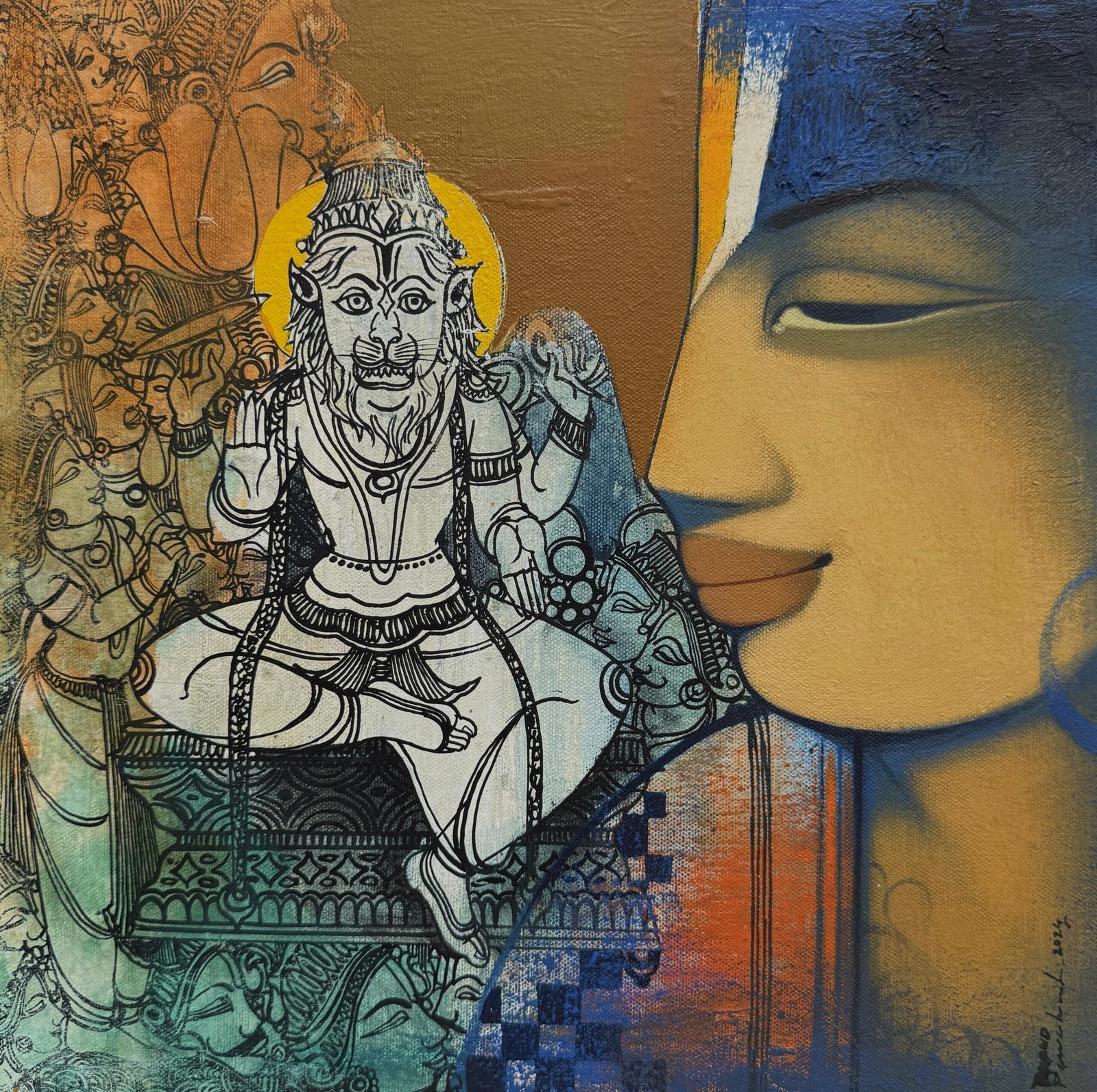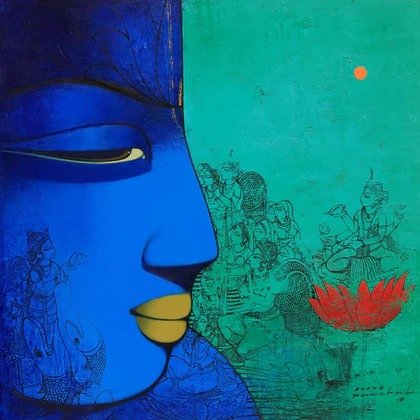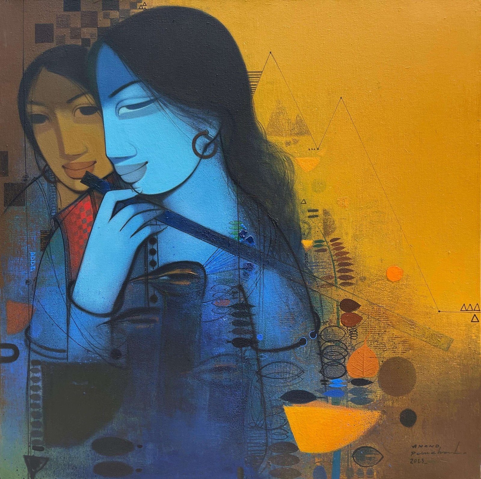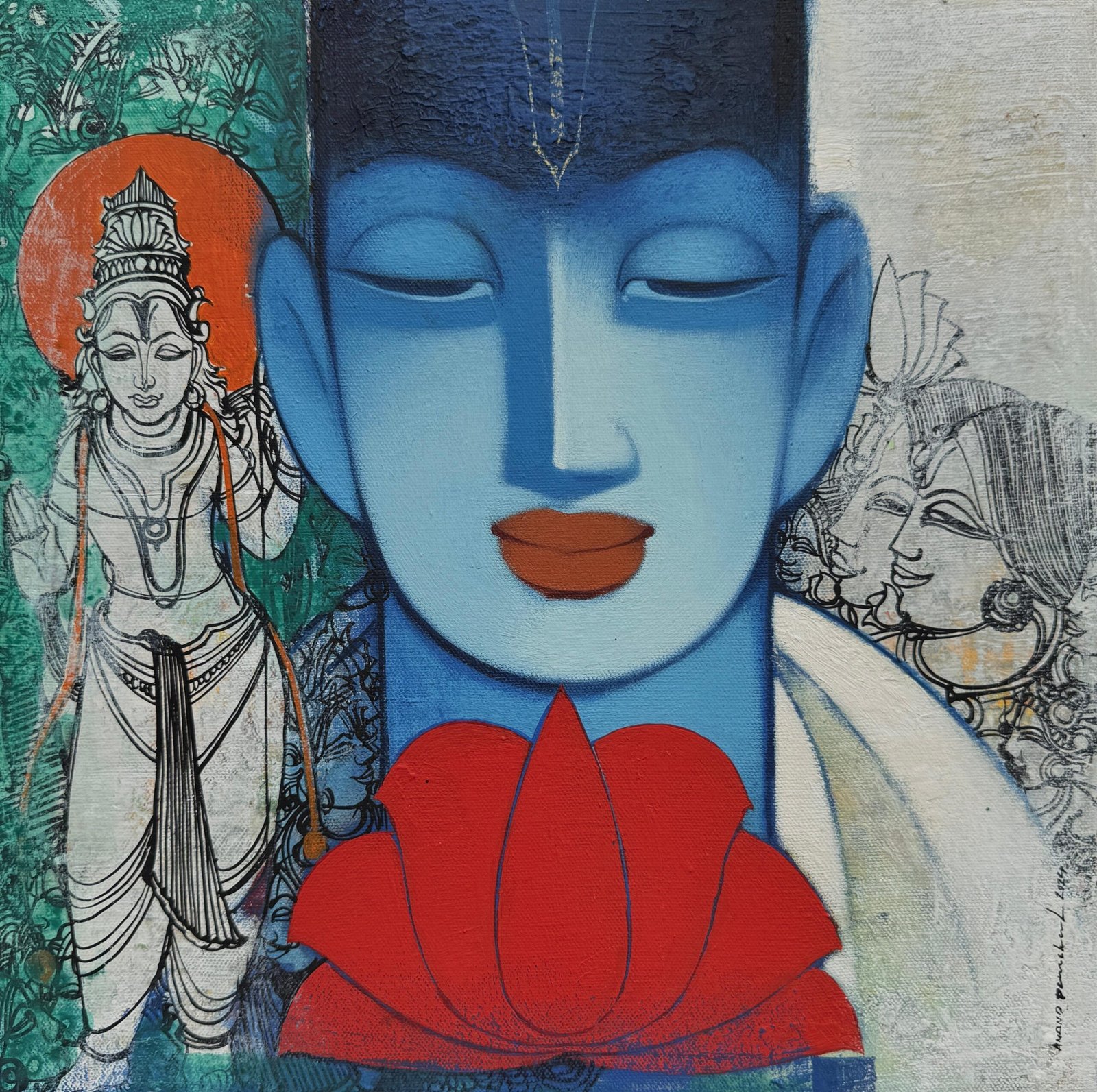 Artist, Anand Panchal, Born on October 11, 1973 in Latur, Maharashtra. His works are in collection with many art lovers in India and abroad. Best known for his figurative artworks. He has developed a unique style of his own. He mostly paints children – capturing their innocence, animals and Brahmins in vibrant colours, which symbolizes calmness, peacefulness and spirituality.