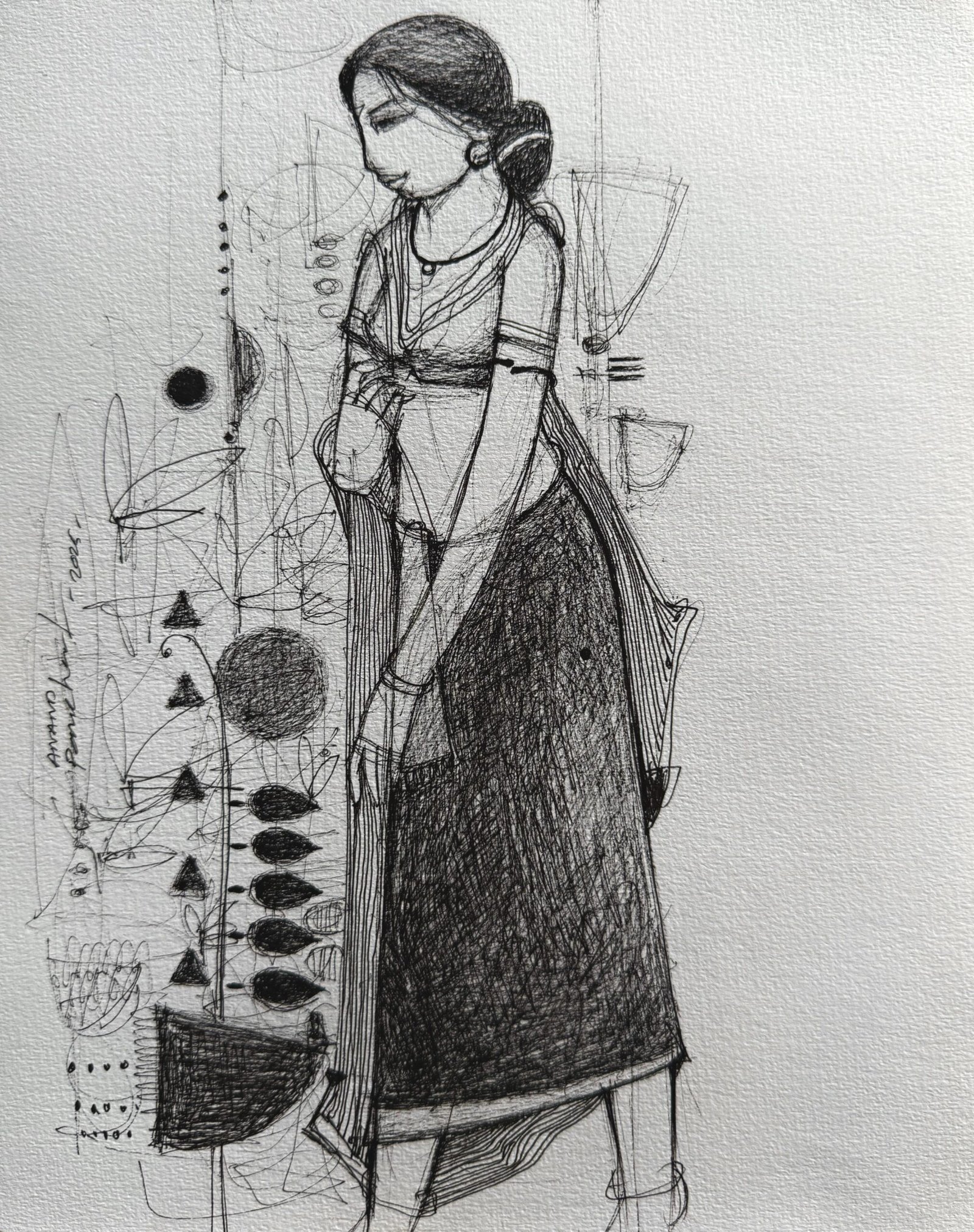 Many of Panchal’s paintings are done in a long, narrow format, which he describes as mimicking the figures of the children that he is painting. In his paintings, the upper portion of the canvas is often devoted to iconic images that indicate the dreams of the foregrounded figure. In one painting, for instance, the background shows a house and a sun, indicating the opposing forces of home and nature. Of his influences, Panchal names Rembrandt, Renoir, and Gauguin. In the future, he plans to try large-scale works of children in groups that incorporate more elements of the village setting.