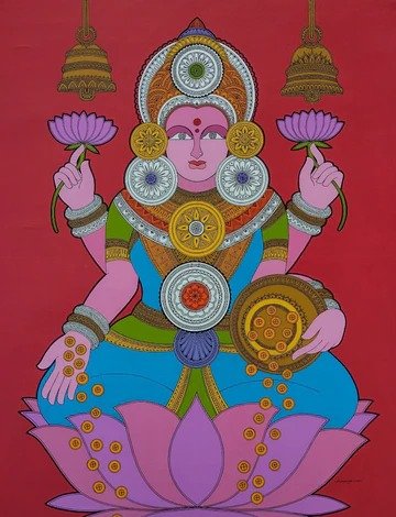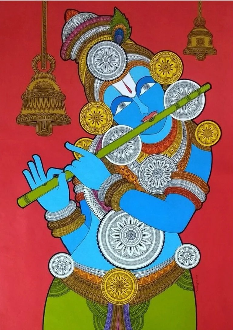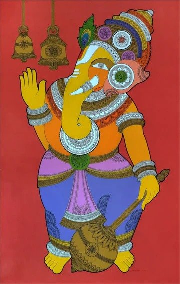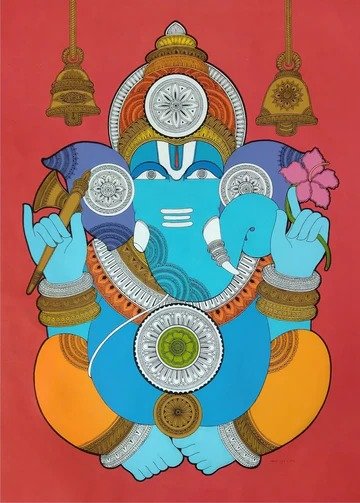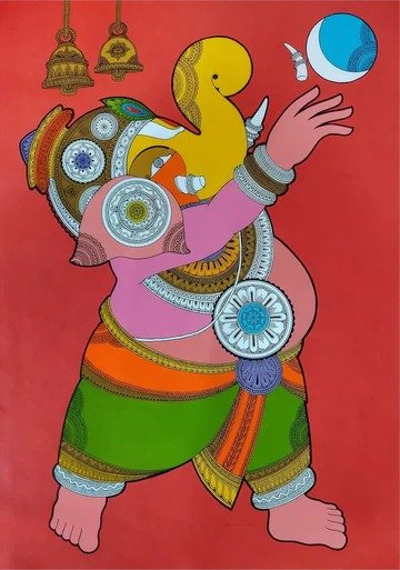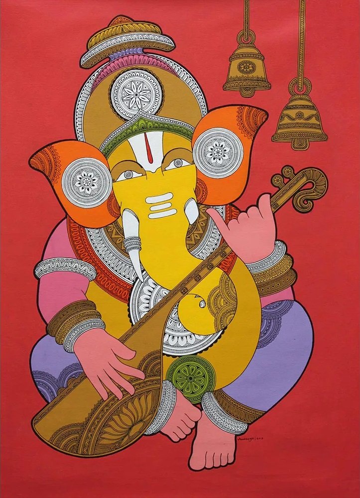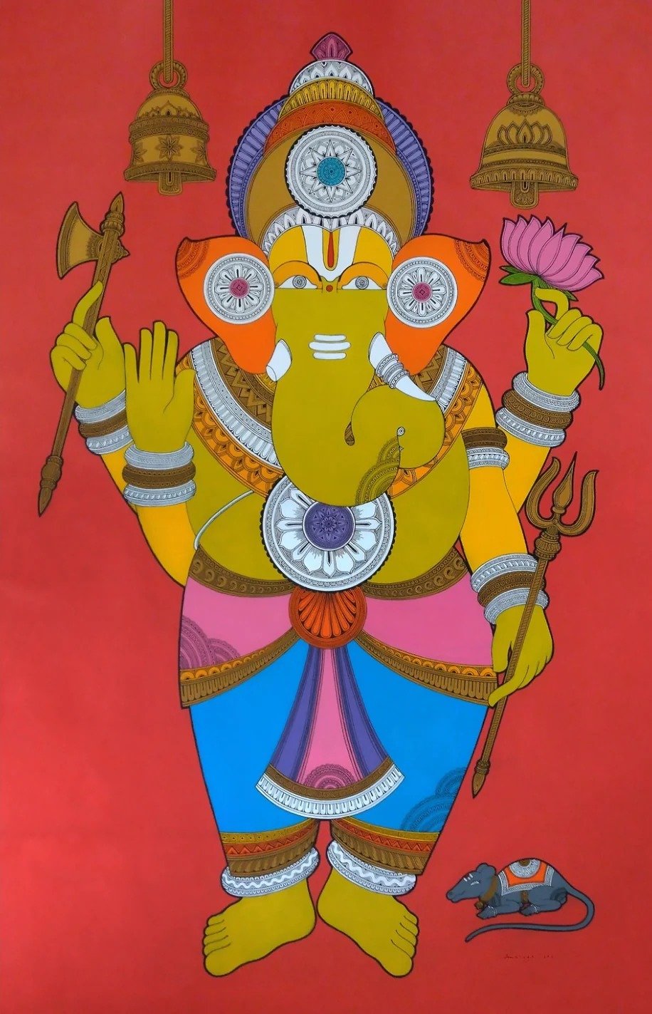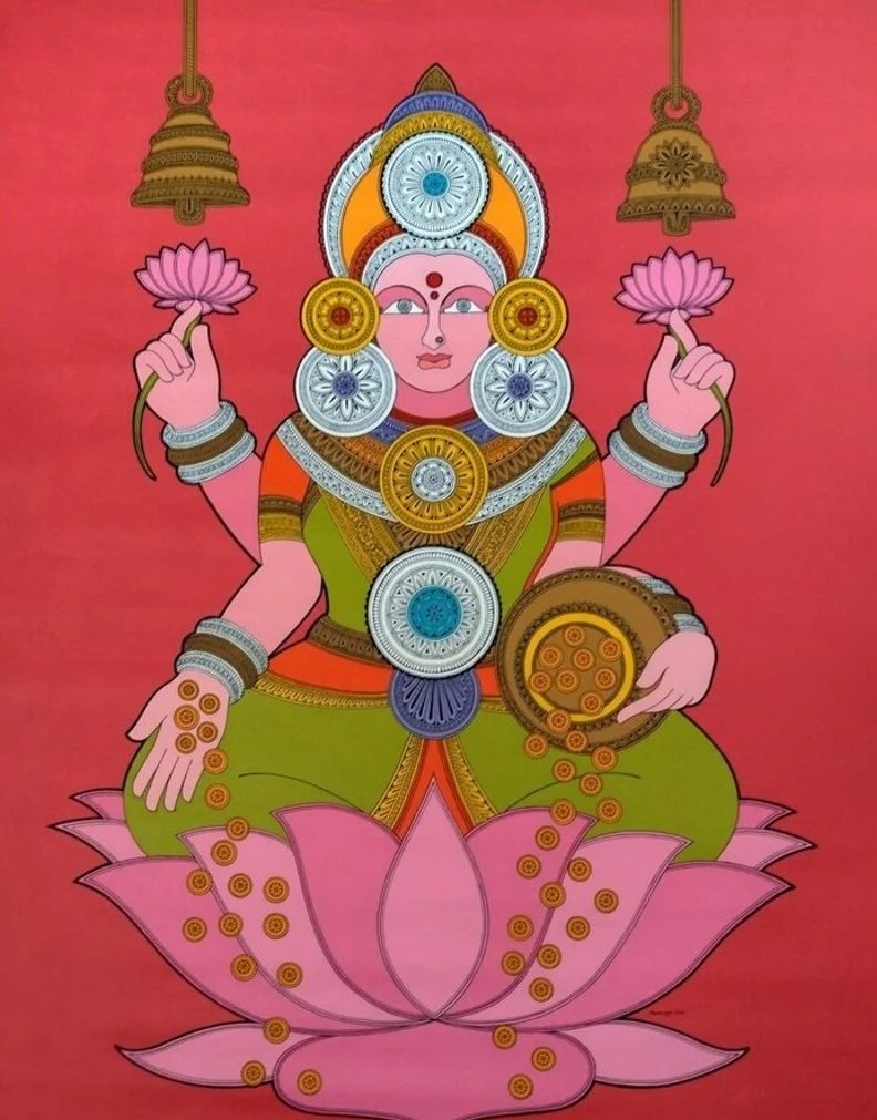 Amongst the details of deities and temple sculptures her most favourite objects are the jewellery of deities and various shapes of bells, that are seen in most of her paintings. Along with the ancient designs, the chromatic combinations of nature-inspired her considerably. Use of bright colours and selection of dynamic red as the background for all her works is the uniqueness of her work.
