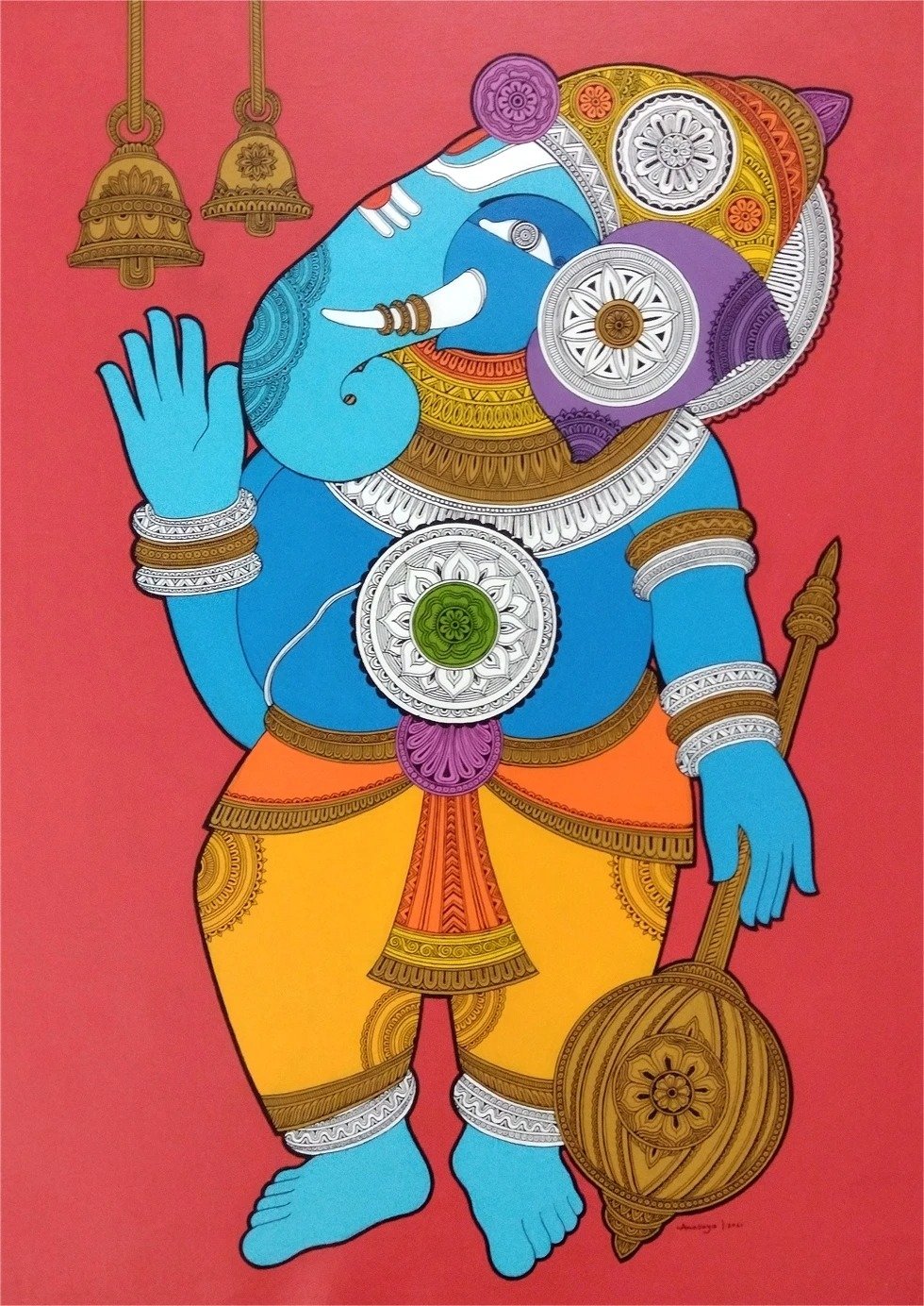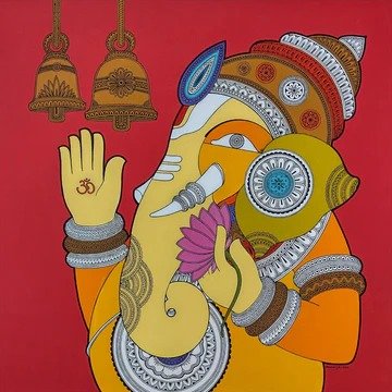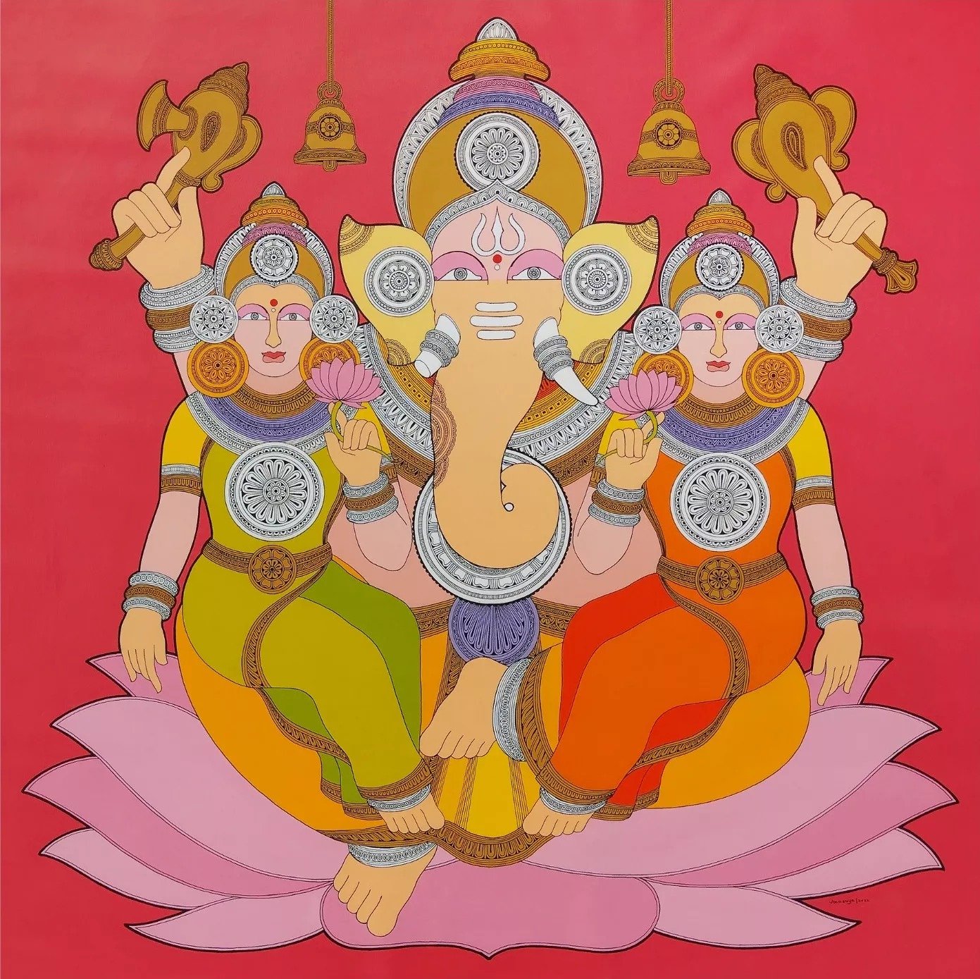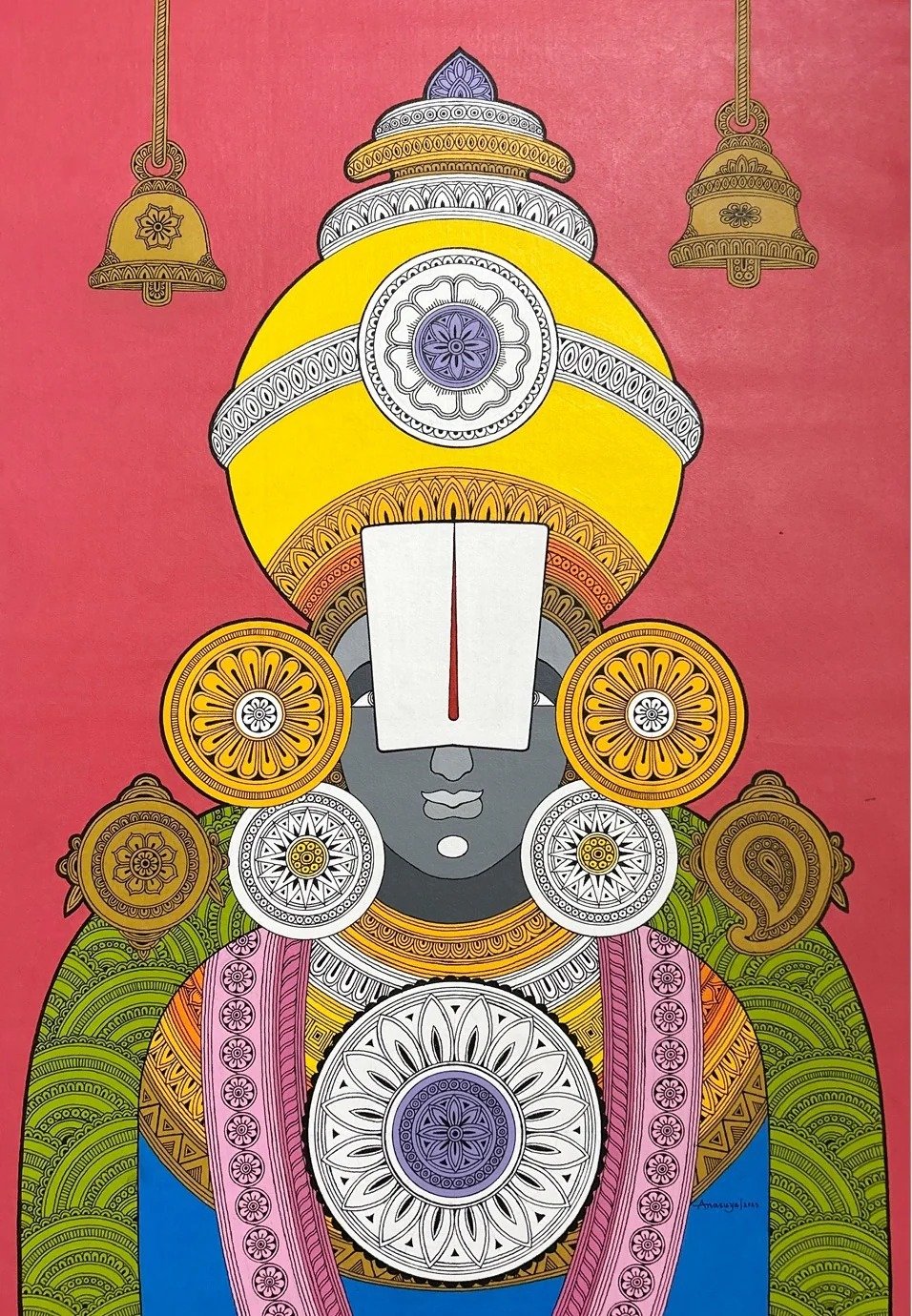 Born in 1983, Artist, Anasuya Bommanaboina’s works are inspired by bright and vibrant coloured characters of Hindu mythology. Anasuya has a routine of often visiting the Hindu temples which gradually built her interest for the details towards the decorative and godly figures and interiors, which is clearly depicted in her style.