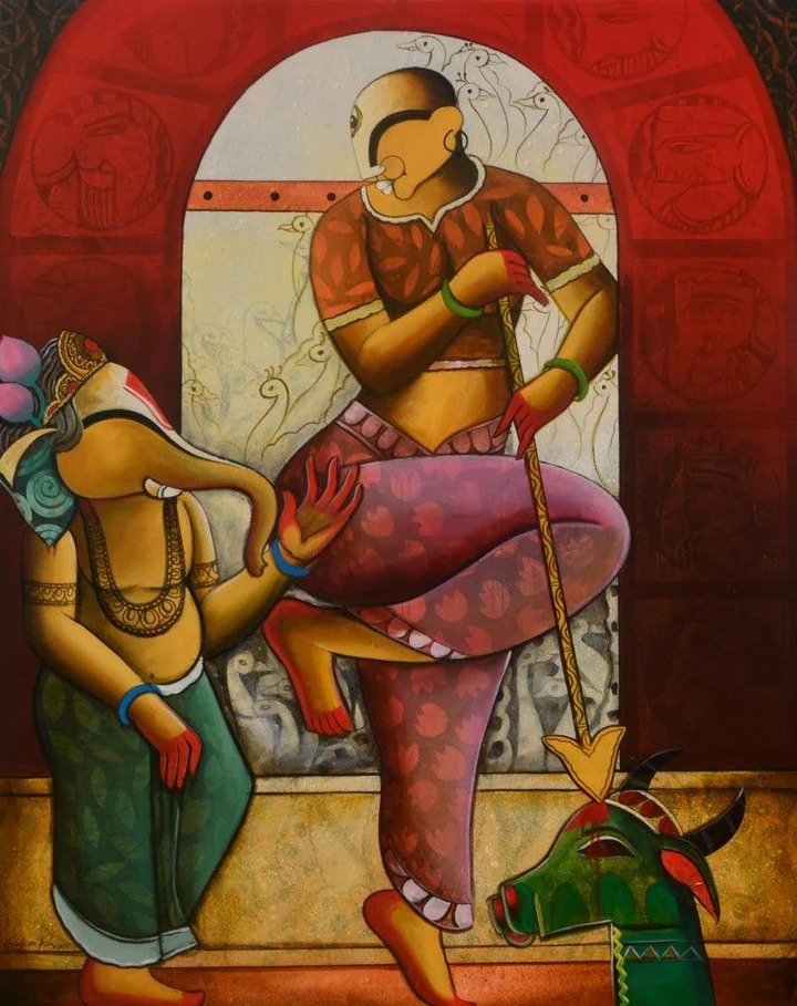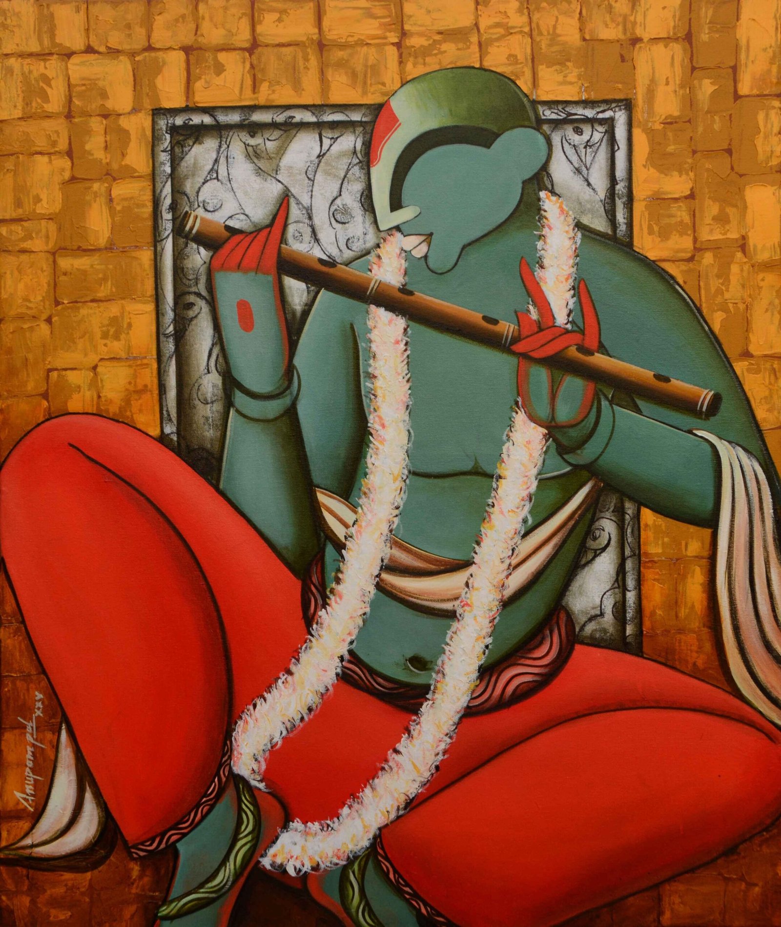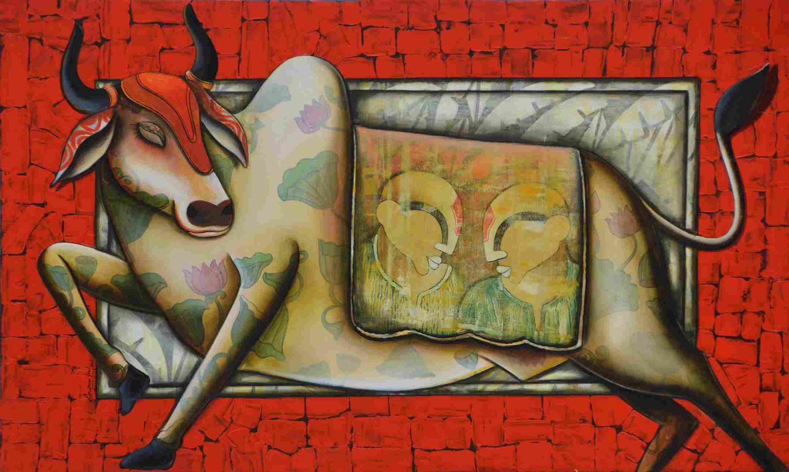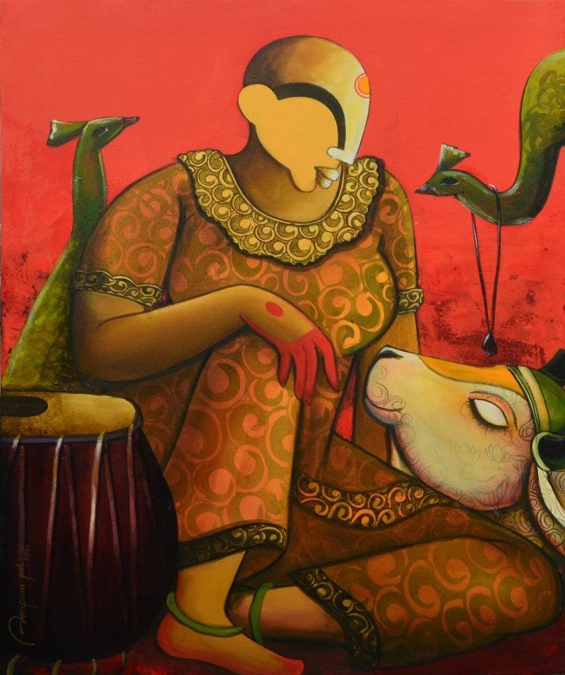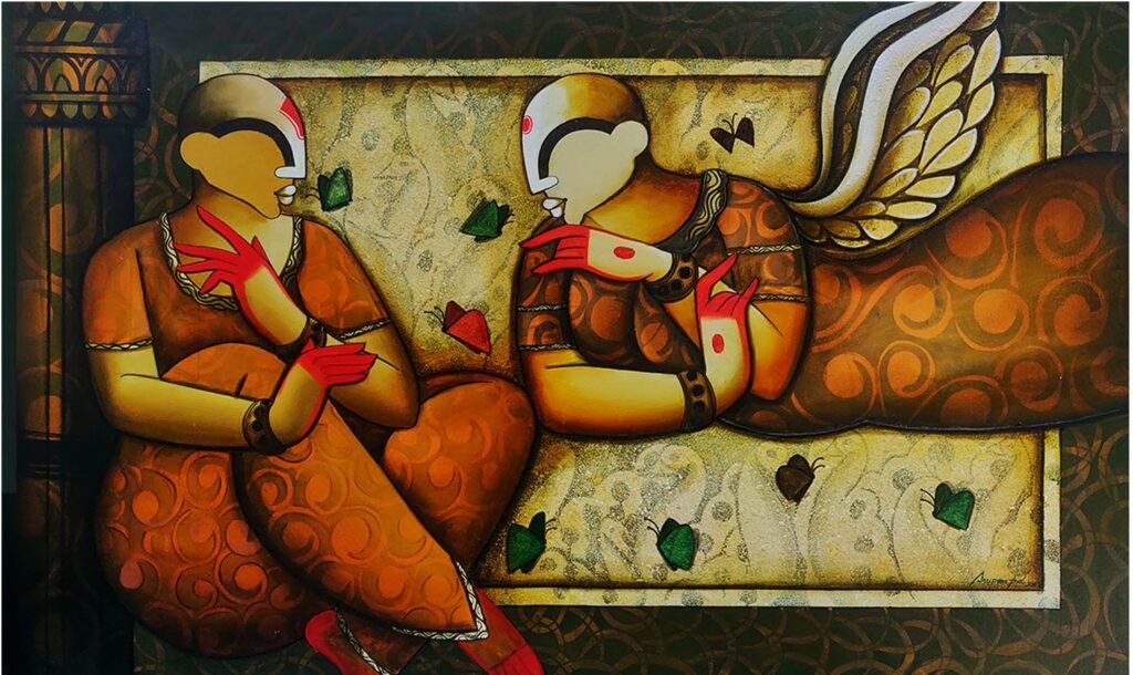 The artist’s dynamic thought process is reflected through his abstract ‘Radha Krishna’ painting. ‘Conservation’ is another ultimate contemporary piece, which visualizes and explains conservative thoughts of the society related to women. Anupam uses a vibrant colour palette on the canvas to reflect mixed moods of his subjects.