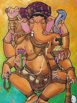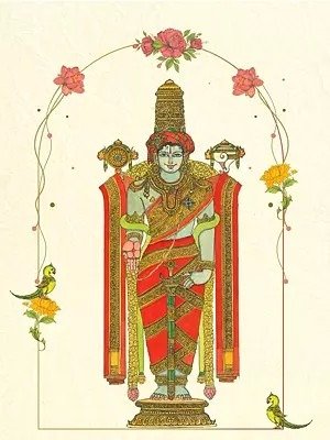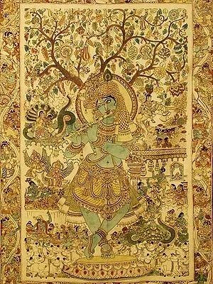 A distinctive strength lies in his ability to merge traditional Kalamkari linework with painterly depth, creating compositions that feel both archival and immediate. Whether capturing the cosmic dynamism of Ananda Tandava Ganapathi or the ceremonial opulence of Vaibhava Govinda, his works carry a palpable sense of movement and spiritual energy. His thematic focus extends beyond deities into cultural memory – festivals like Medaram Jathara are rendered with the same reverence and complexity, situating his practice within a living, evolving tradition.