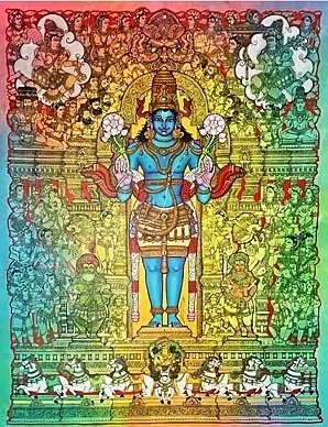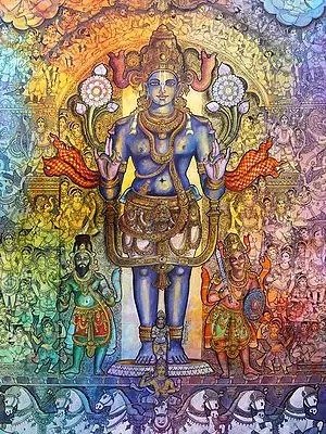 Dhanu Andhluri’s artistic language is deeply anchored in the rich visual traditions of Kalamkari and classical Indian iconography, reinterpreted through a contemporary lens. His oeuvre is dominated by large-scale, intricately detailed compositions depicting mythological narratives – ranging from Rama Rajyabhishekam to Krishna Leela and powerful singular deities such as Surya, Venkateswara, and Shiva.