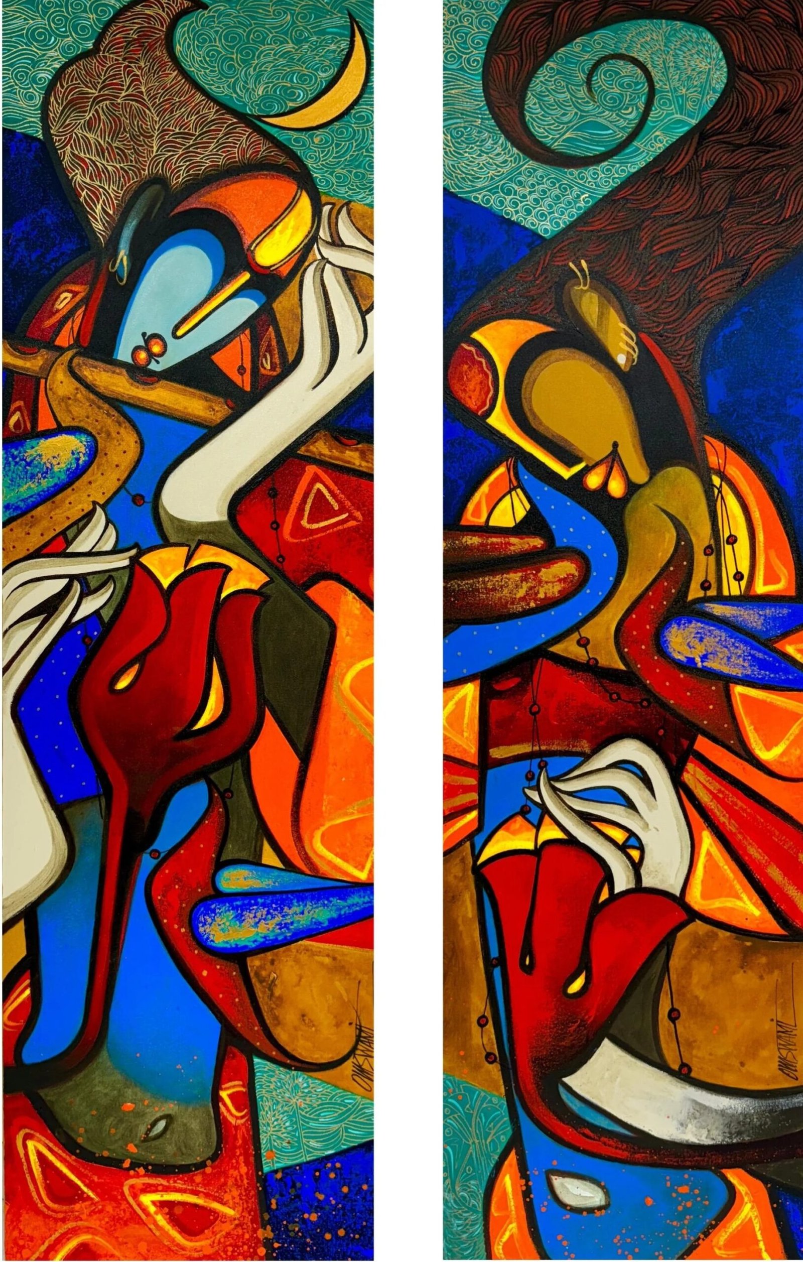 Om Swami is a Mumbai based artist who has studied at the Raheja College. The beauty of his work is in the fluidity & movement of his subjects. Even in his figurative works where no movement is depicted, one takes one look at the subject & can feel the energy within the painting.