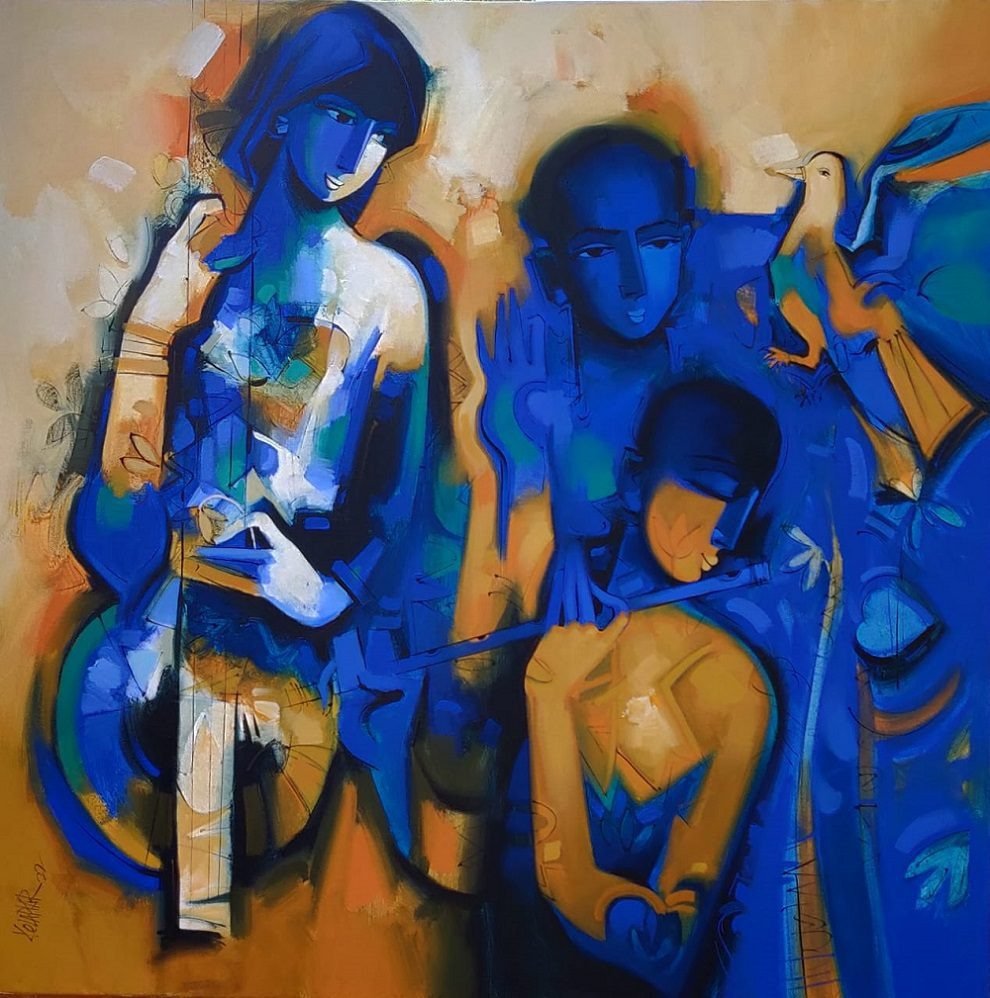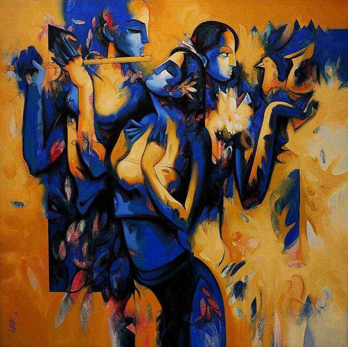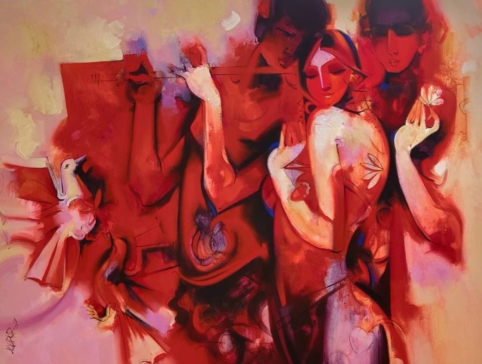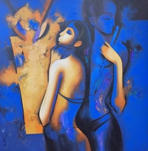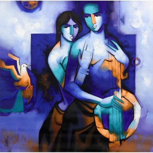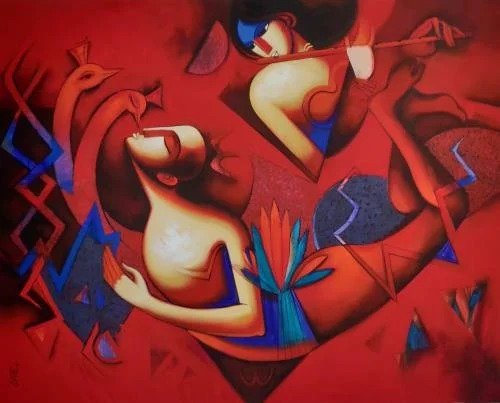 Artist, Arvind Kolapkar is an artist from Pune who is greatly inspired by music, particularly classical and folk music which has played a predominant role in the work. works are bright, happy expressions of joyous unions. In most of his paintings, one observes an amorous couple or groups of friends enjoying each other’s company. For Kolapkar, painting is an ongoing process of creative activity where emotion and music plays a greater role in the end product.