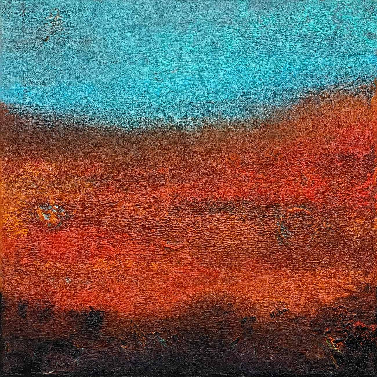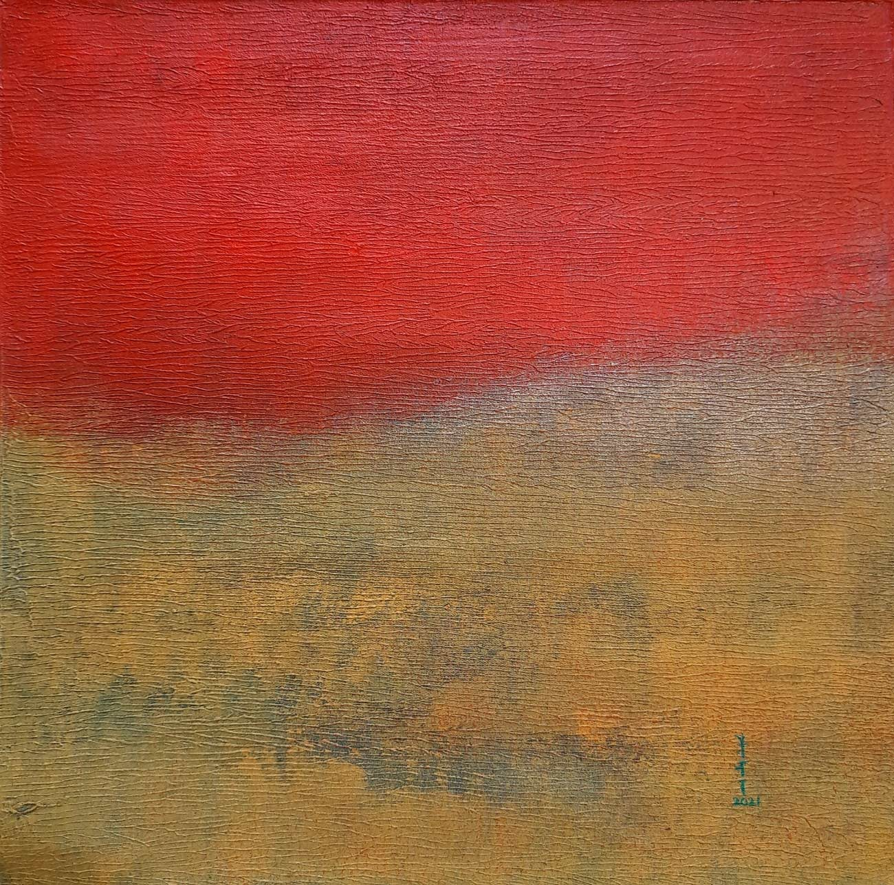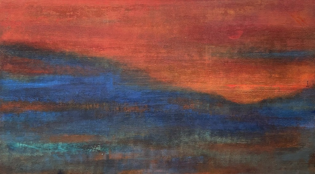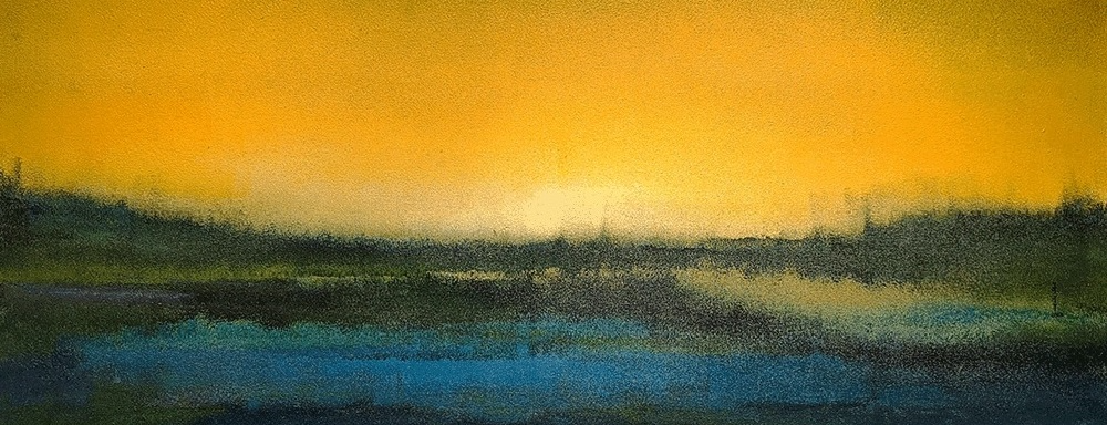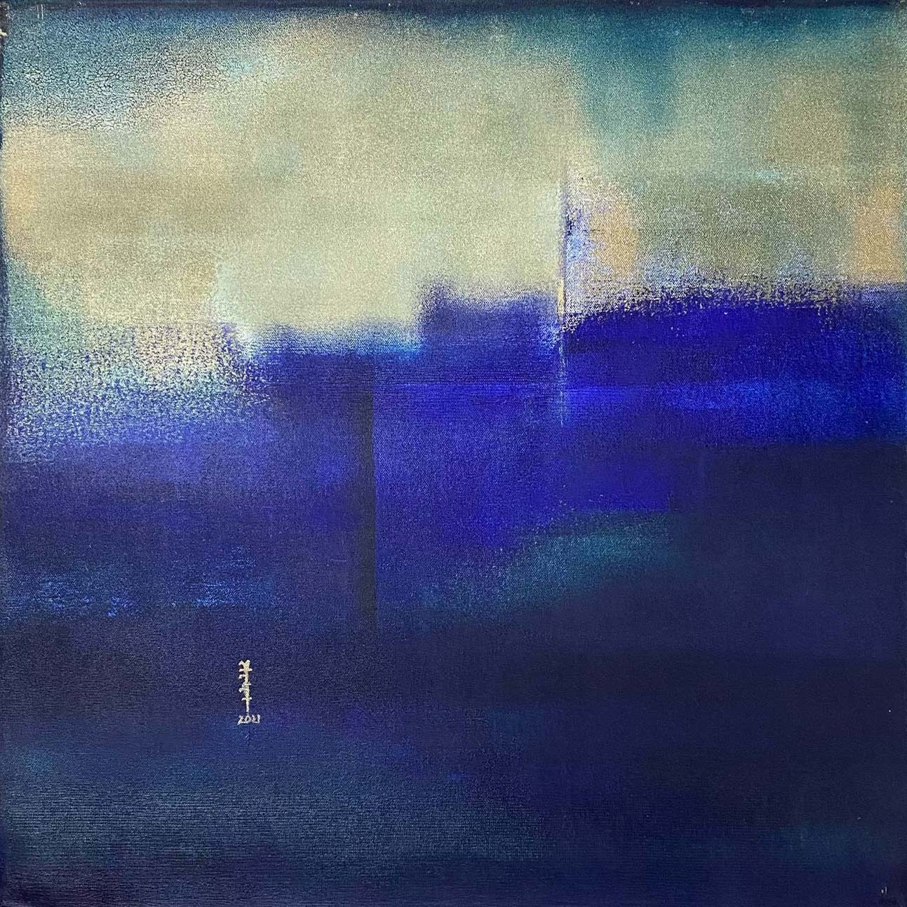 Her canvases are built through layered acrylics, where translucent washes, textured surfaces, and subtle tonal transitions create a sense of depth and quiet luminosity. Rather than depicting landscapes directly, Maithani distils their emotional essence – allowing colour, form, and atmosphere to evoke the experience of being within nature.