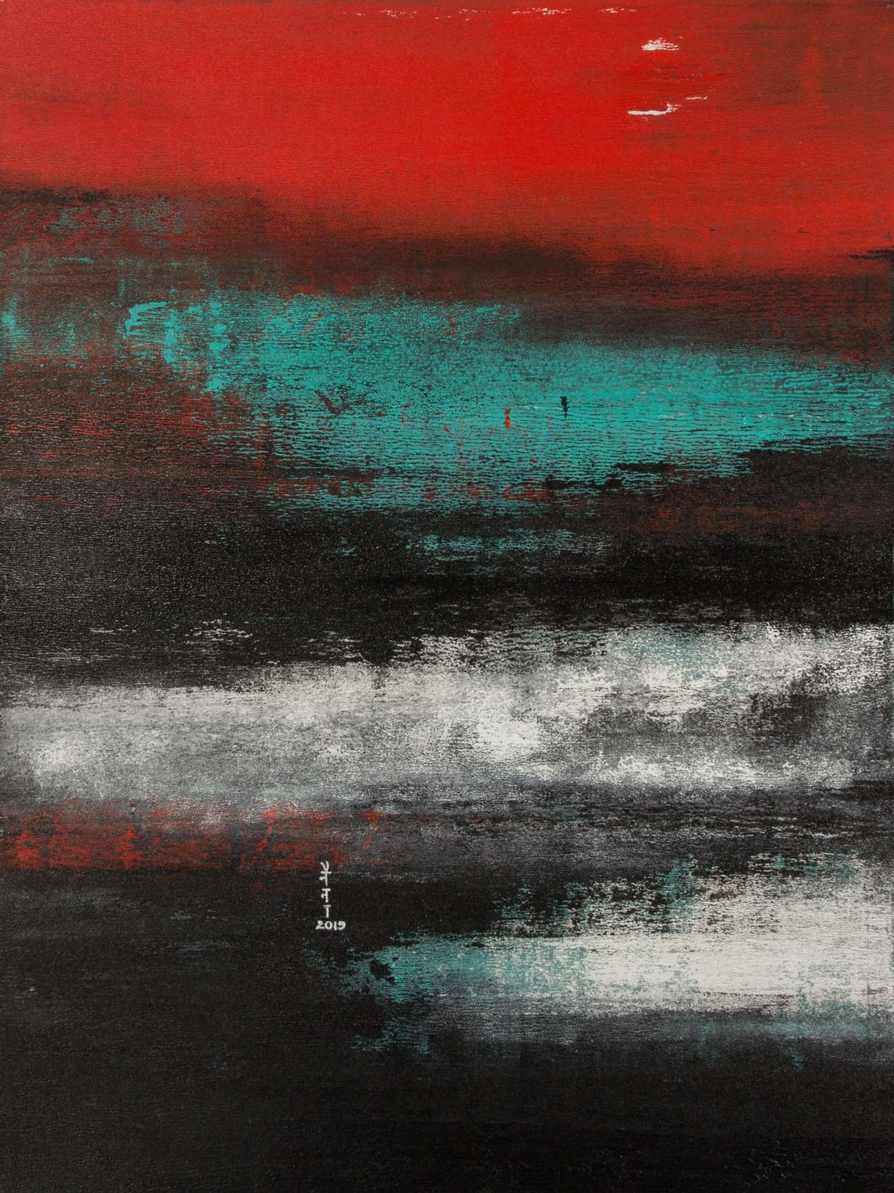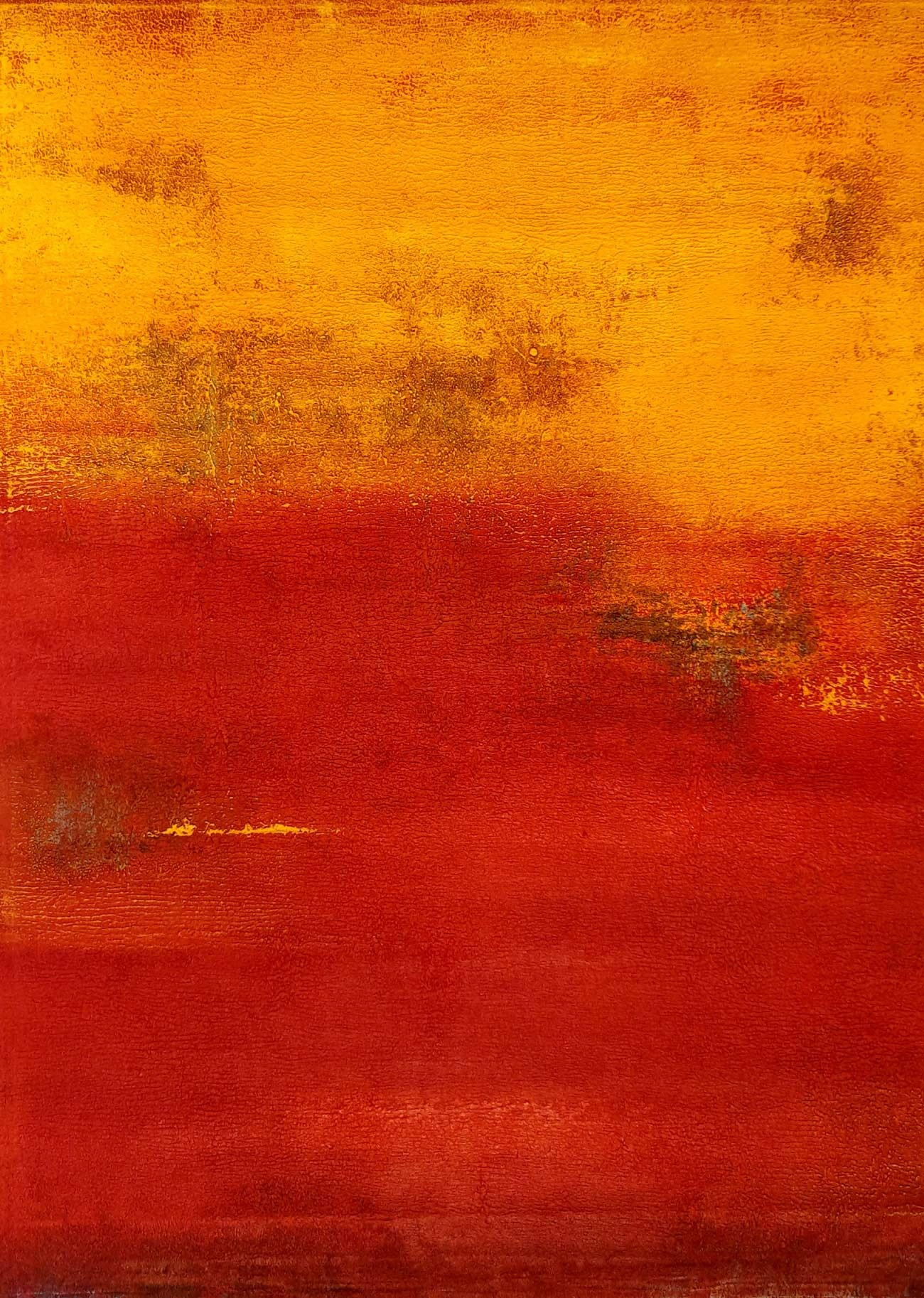 The artist’s life across multiple geographies has left a clear imprint on her work. Memories of Dehradun’s Himalayan landscape, along with impressions from Vietnam, Southeast Asia, the Middle East, and India’s evolving urban environments, emerge as abstracted visual echoes within her compositions. These works often suggest horizons, shifting skies, and elemental terrains without ever settling into literal form.