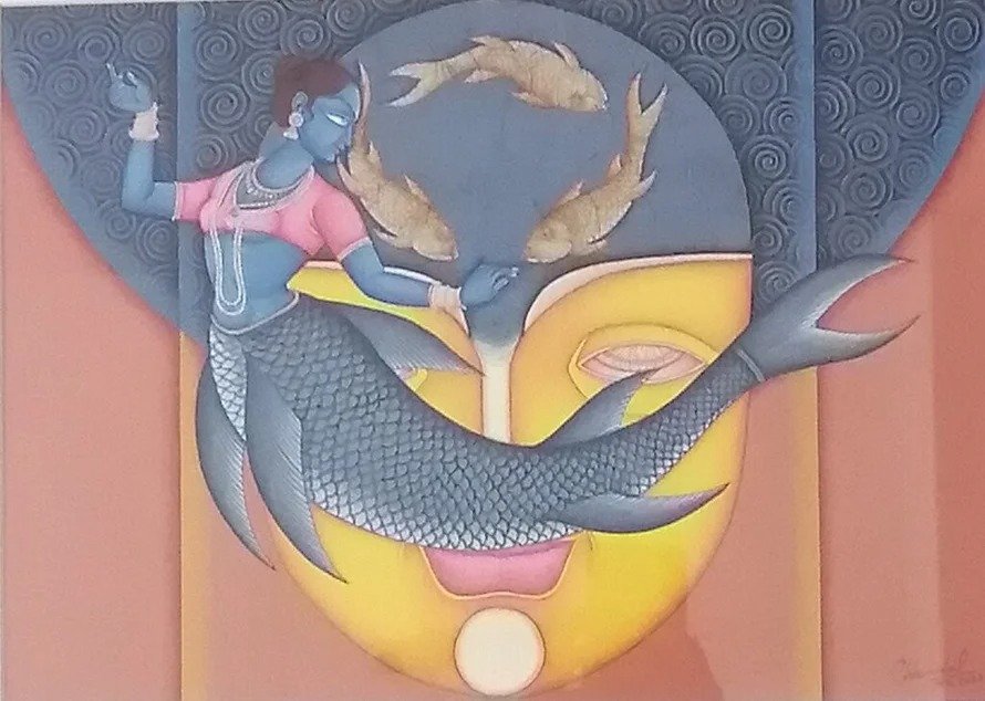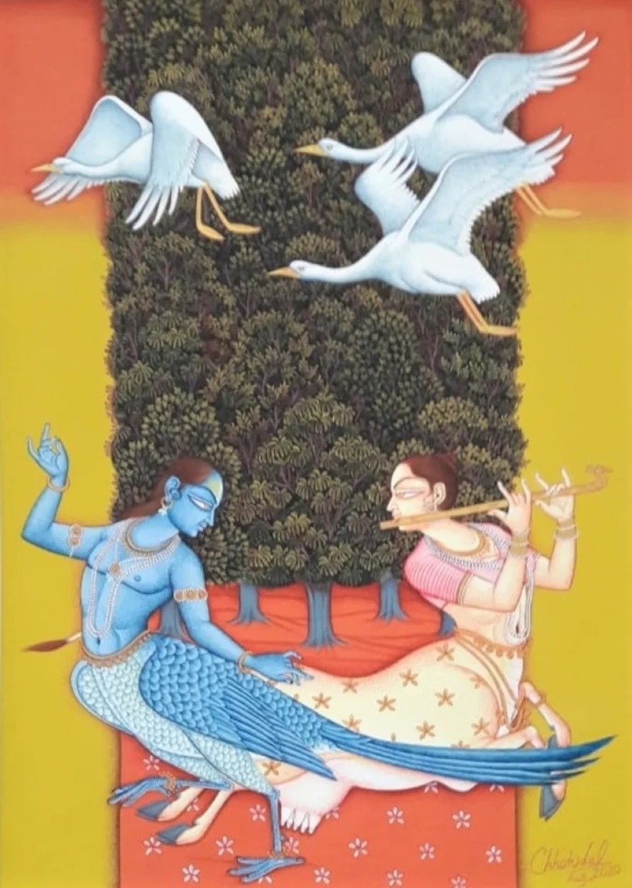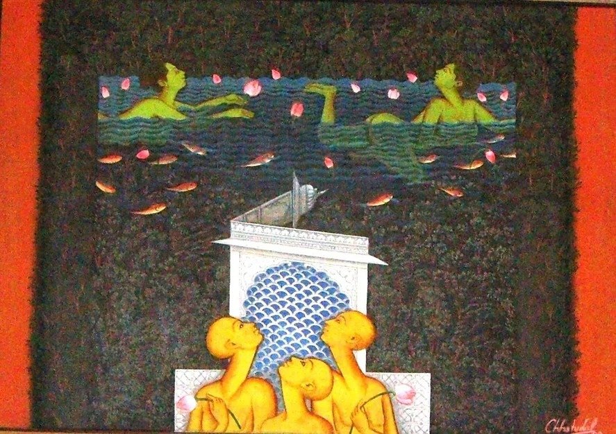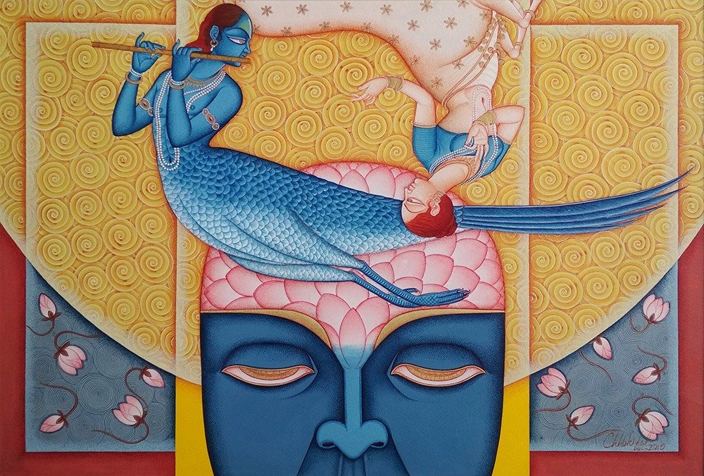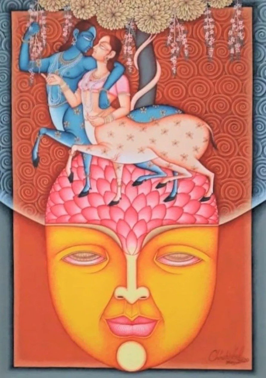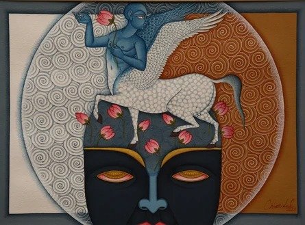 Lal’s imagery frequently draws upon mythological narratives, reinterpreted through a subtle modern lens. Rather than mere replication of tradition, his paintings evoke a dialogue between past and present, where classical iconography is rendered with renewed vitality and introspection.