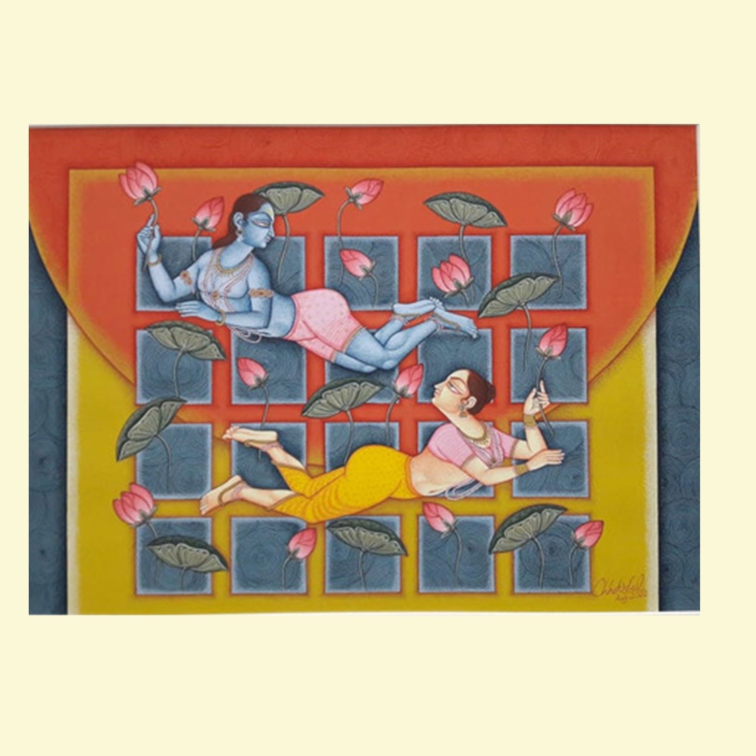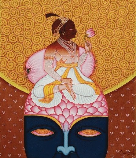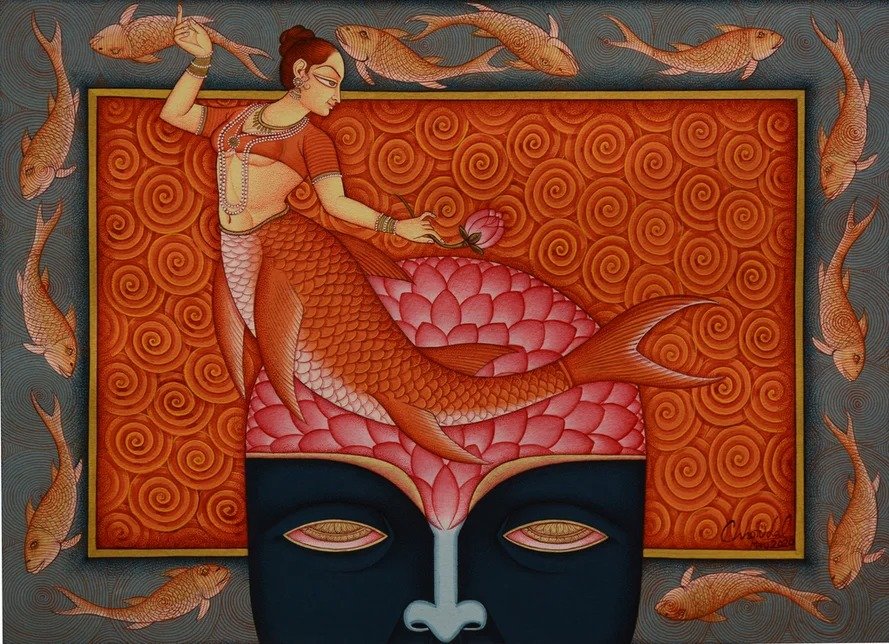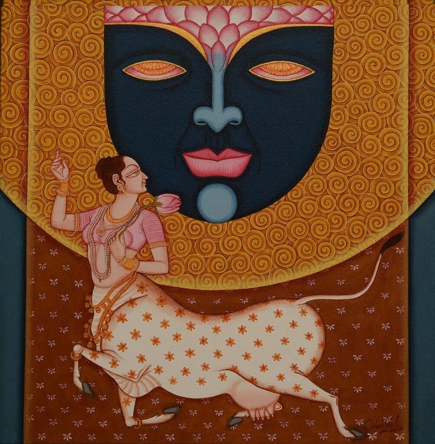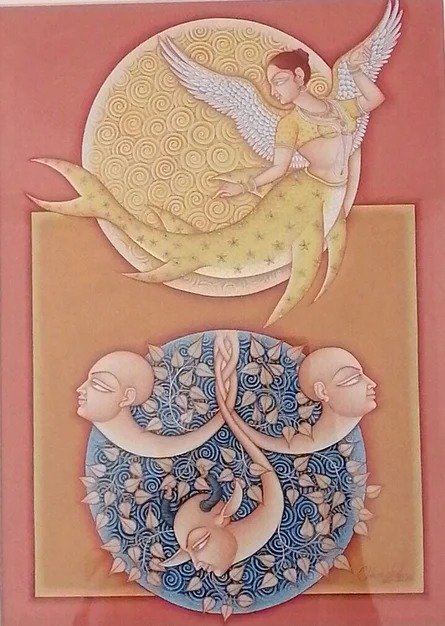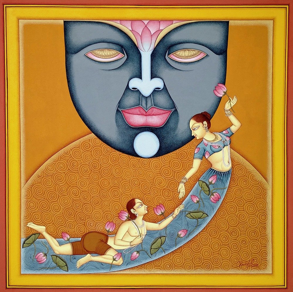 Lal’s imagery frequently draws upon mythological narratives, reinterpreted through a subtle modern lens. Rather than mere replication of tradition, his paintings evoke a dialogue between past and present, where classical iconography is rendered with renewed vitality and introspection.