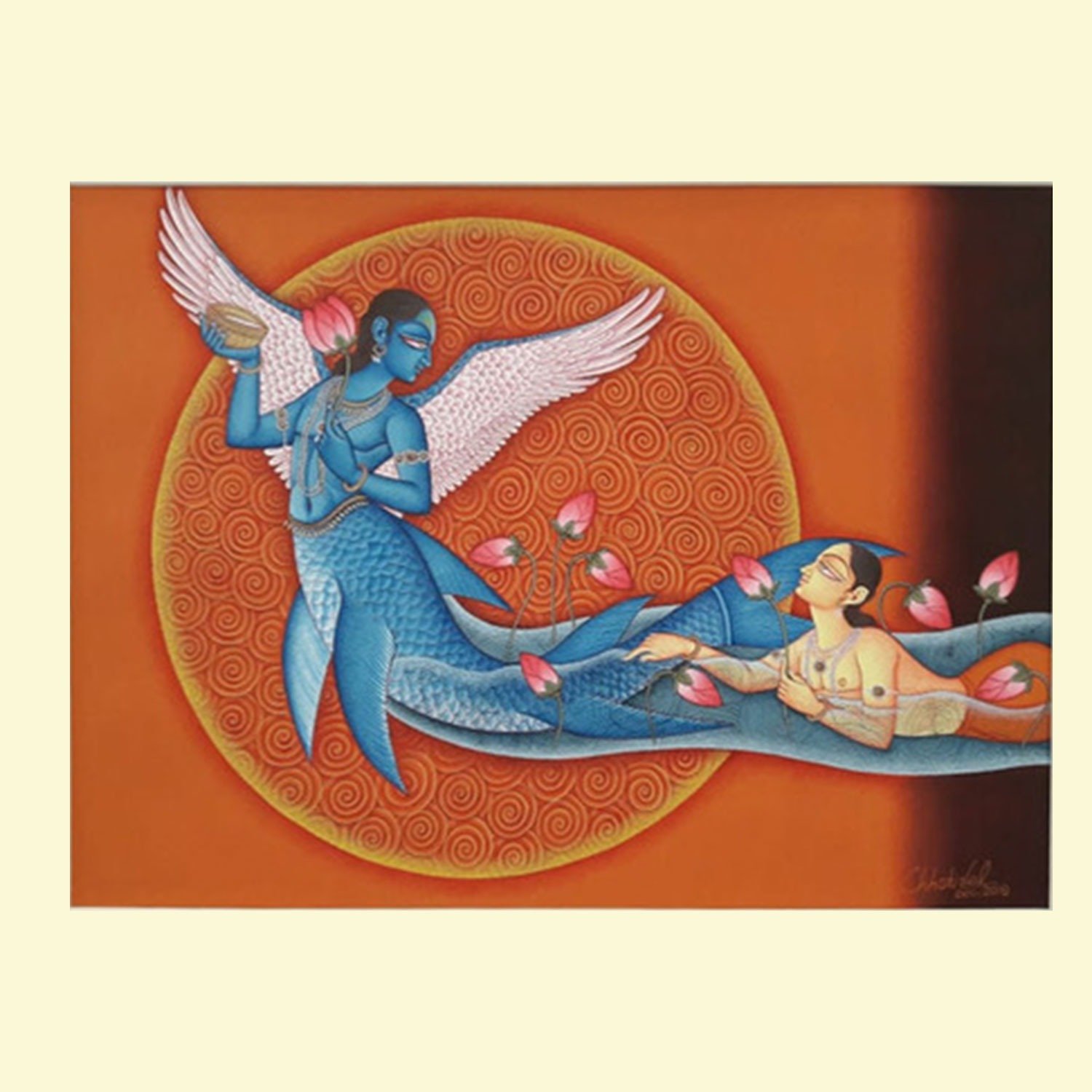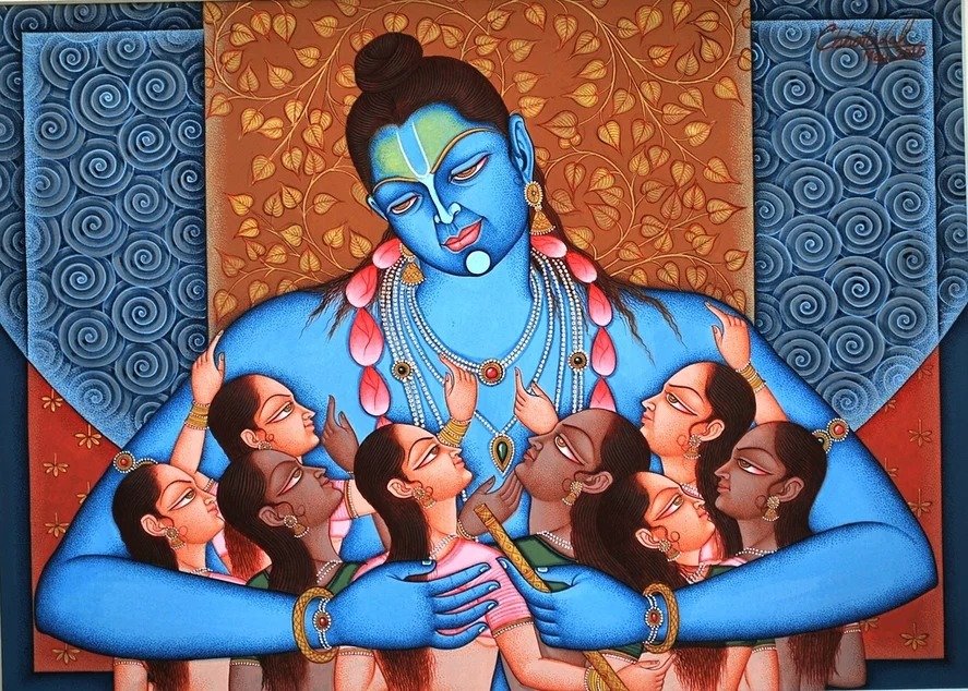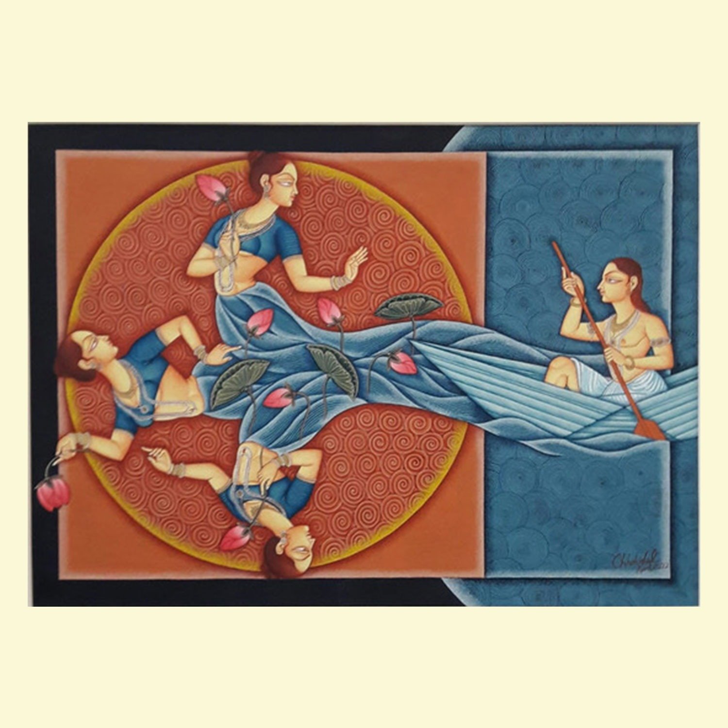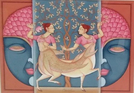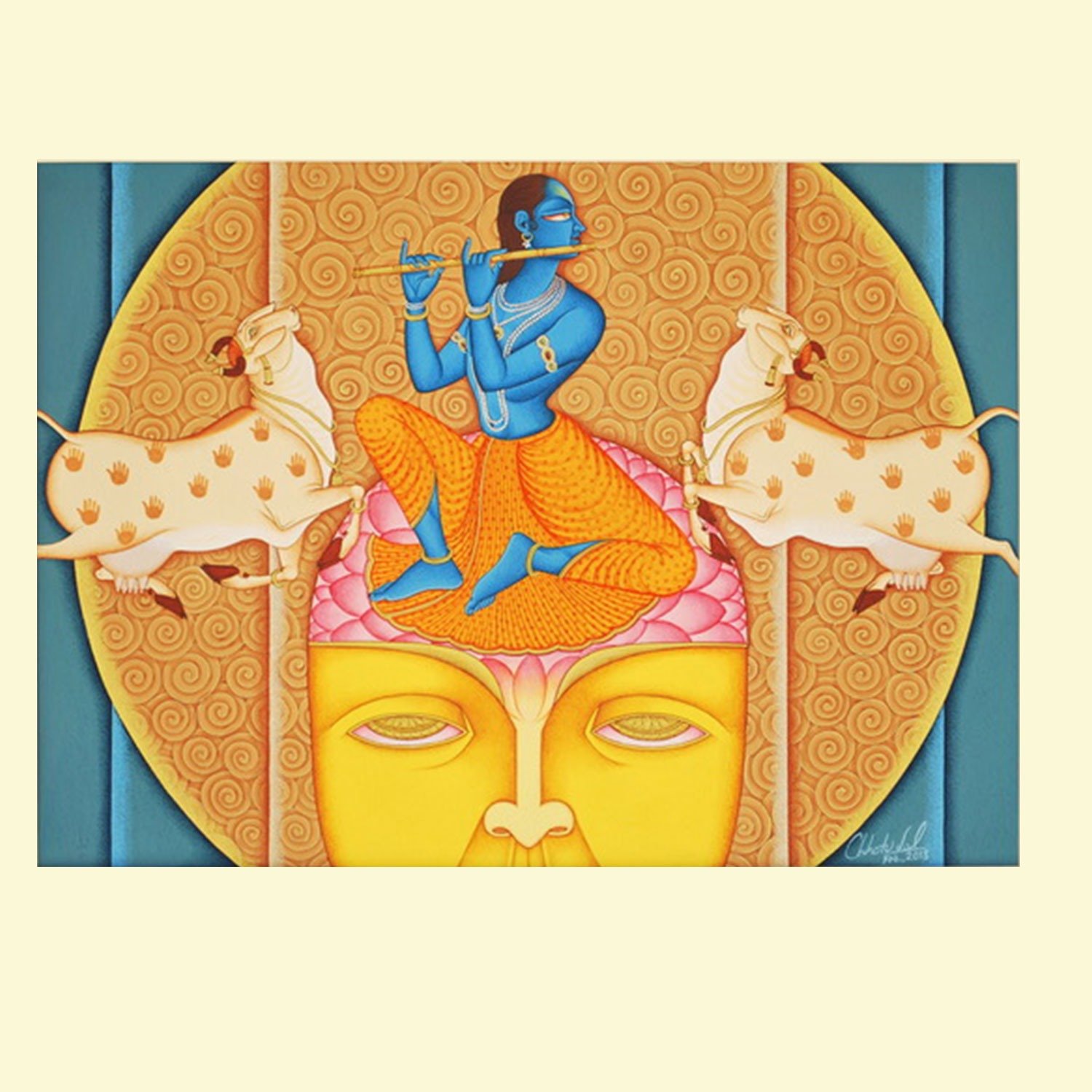 Lal’s imagery frequently draws upon mythological narratives, reinterpreted through a subtle modern lens. Rather than mere replication of tradition, his paintings evoke a dialogue between past and present, where classical iconography is rendered with renewed vitality and introspection.
