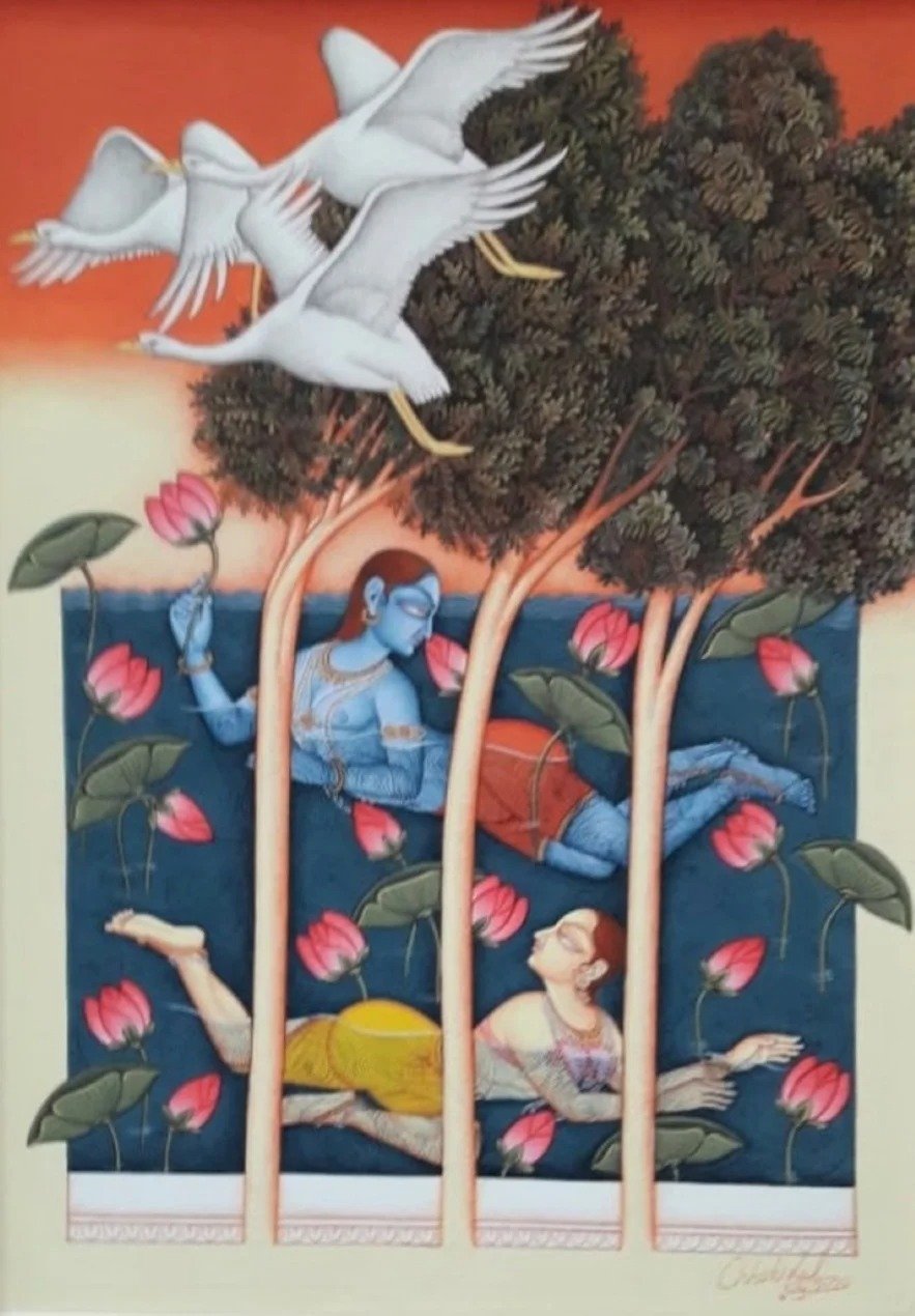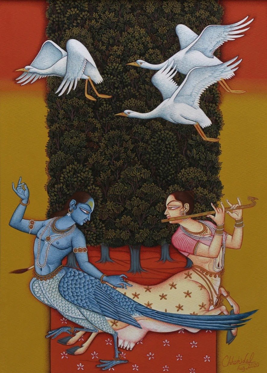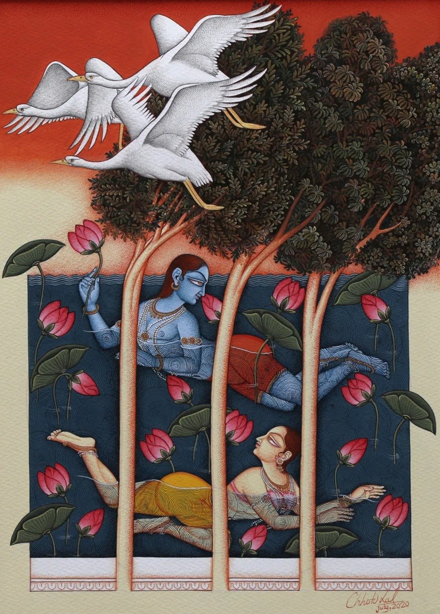 Artist, Chhotu Lal stands among the foremost contemporary practitioners of the Indian miniature tradition, working from his studio in Udaipur. His practice is distinguished by an exacting adherence to classical technique, combined with a quiet, contemporary sensibility that lends his compositions both precision and poetic depth.