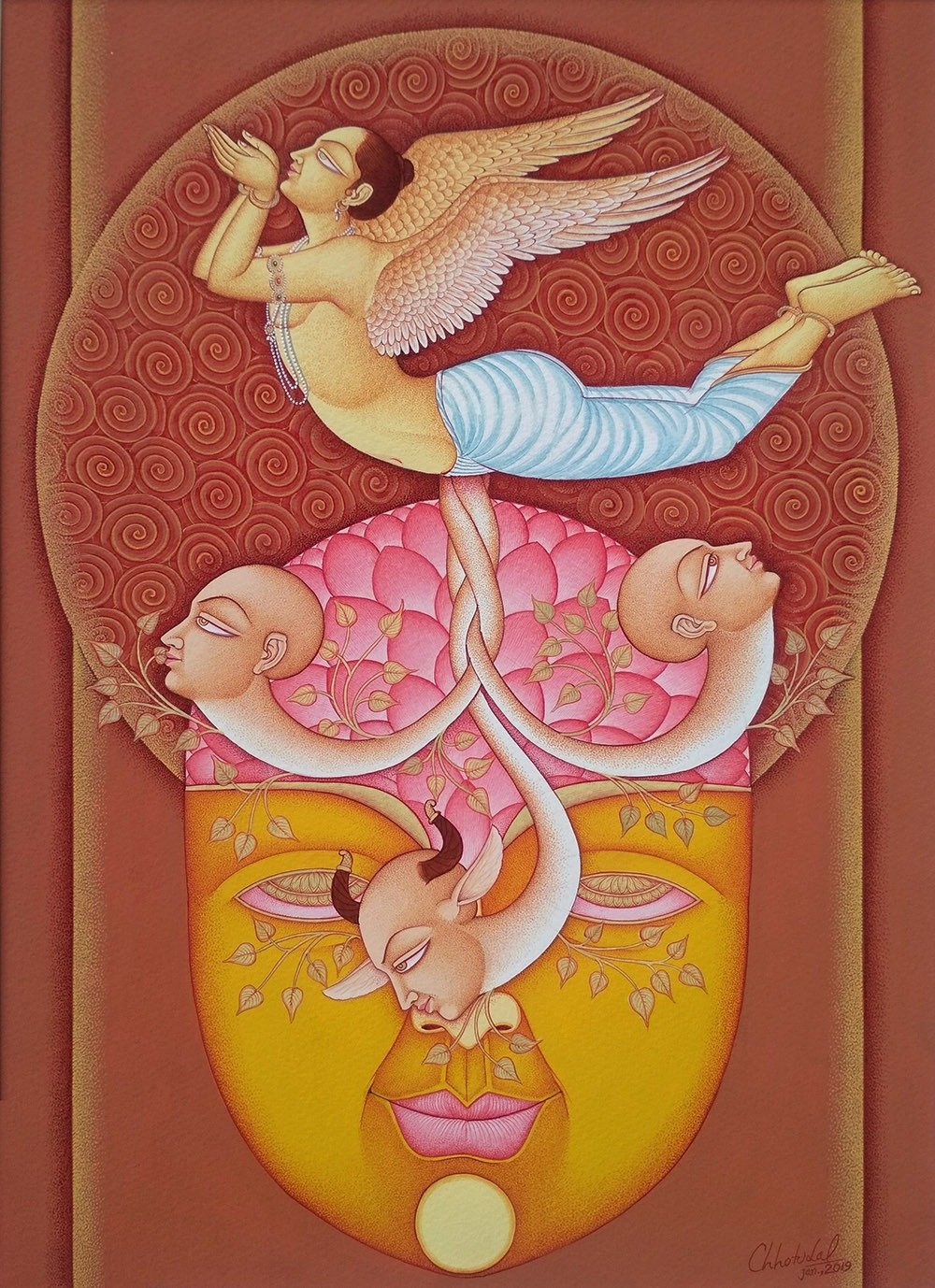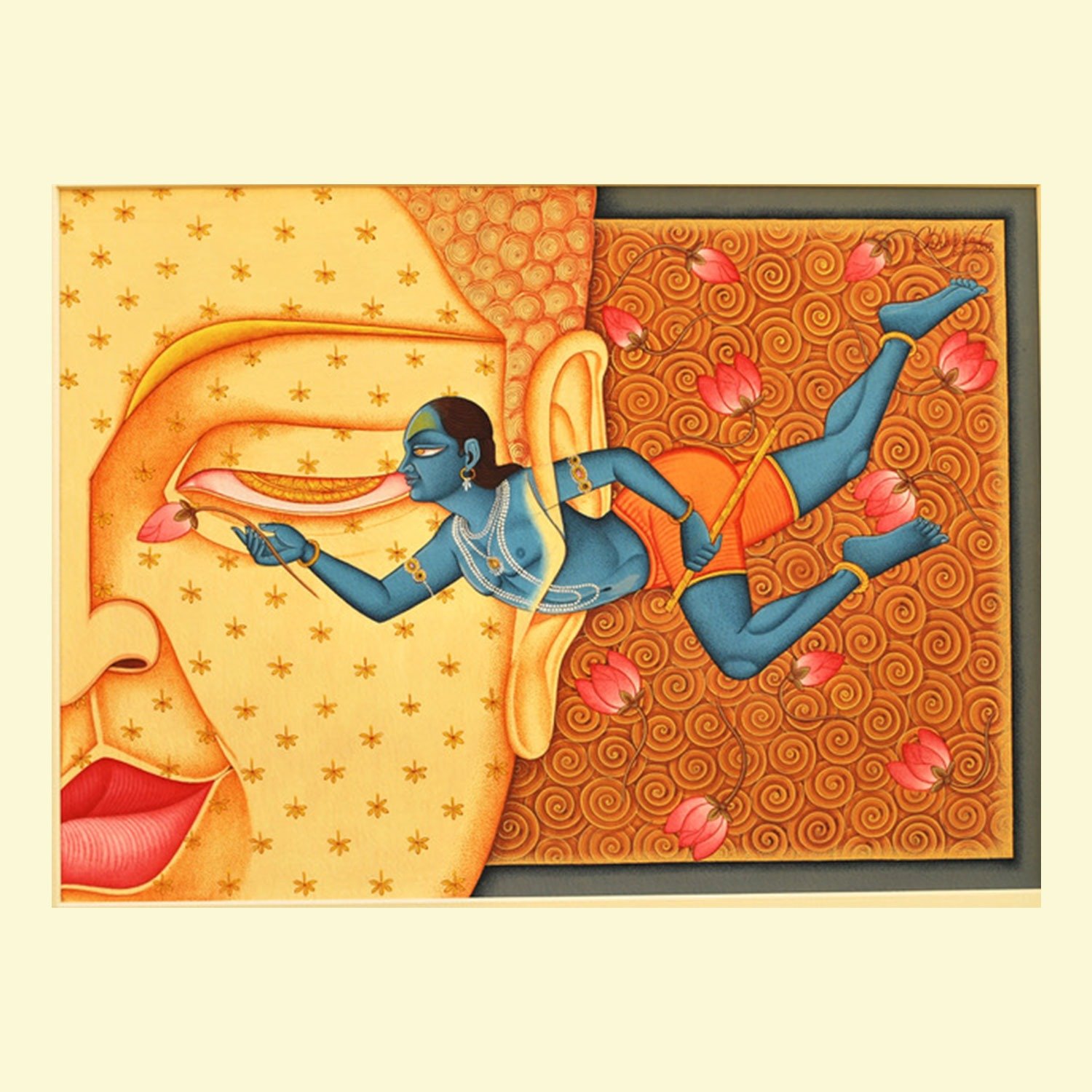 Working primarily in watercolour on mica, alongside tempera, Lal employs a painstaking process rooted in heritage methods. His pigments are prepared by hand from natural minerals and vegetable extracts, while his brushes—often fashioned from feathers – allow for an extraordinary fineness of line. The resulting works possess a luminous delicacy, marked by intricate detailing and a refined, almost meditative stillness.