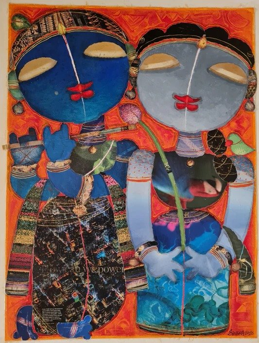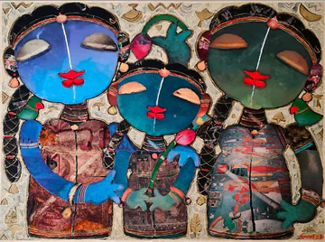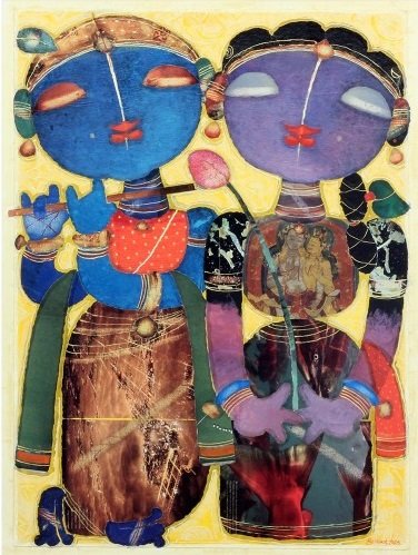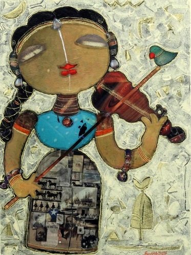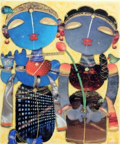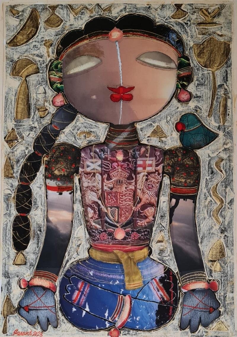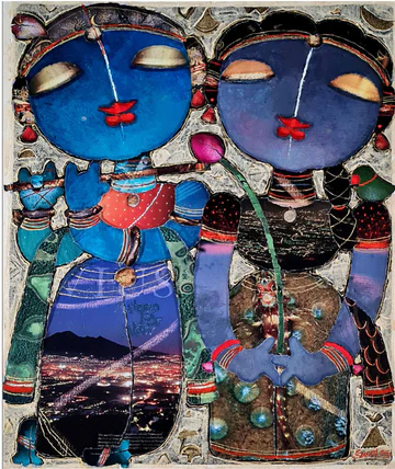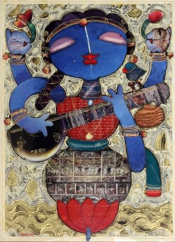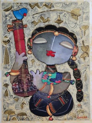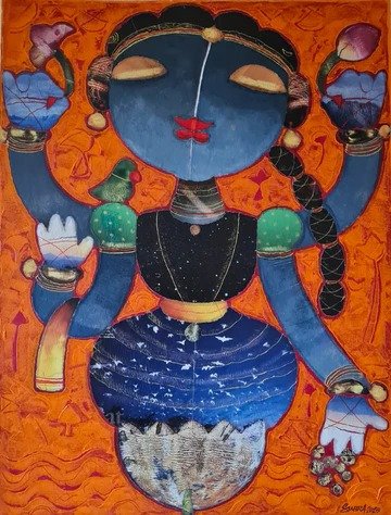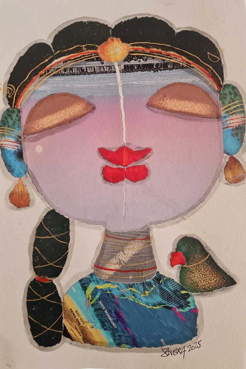 Inspired by the costumes that his father would wear as a theatre artist, the artist works in mixed media and using various techniques, such as calligraphy, and different styles/themes, such as abstract backgrounds, Indian myth and tradition to bring his collages to life. He has portrayed Krishna, Buddha, Ganesha and other mythological figures in his work. Subramanian has been honoured with numerous awards, among them are Tamil Nadu State Lalit Kala Akademi Award (1998), AIFACS Award, All India Fine Arts & Crafts Society, New Delhi (2000) and Saudia 6th Malwan GCC Countries Biennale Award (2003).