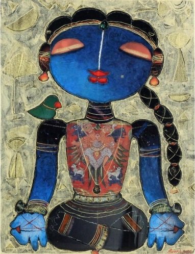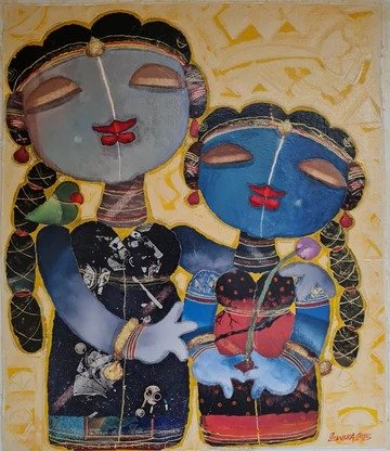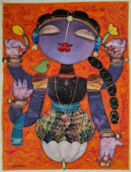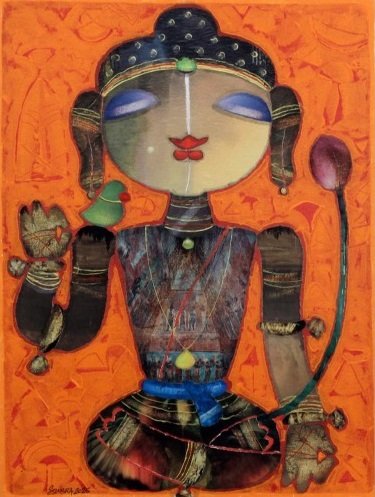 “I started working on images of Gods, Goddesses, parrots, flowers like the lotus and the smiling face of my daughter always find a place in my art. These subjects come naturally to me. The mythological images like Buddha, Ganesha, Krishna and Saraswati come from my childhood memories growing up in the coastal village listening to mythological stories narrated by the elders. My daughter loved birds and the parrot was her favourite, so all my paintings will depict one. The inspiration and spark behind my art is the smile of my daughter. For me texture is a very important and helps me connect with the viewers. I want the person looking at my art to not only understand the emotion behind it but to also feel it” shares the Artist.