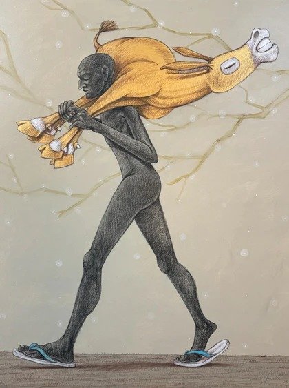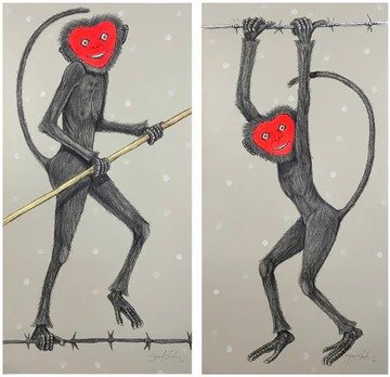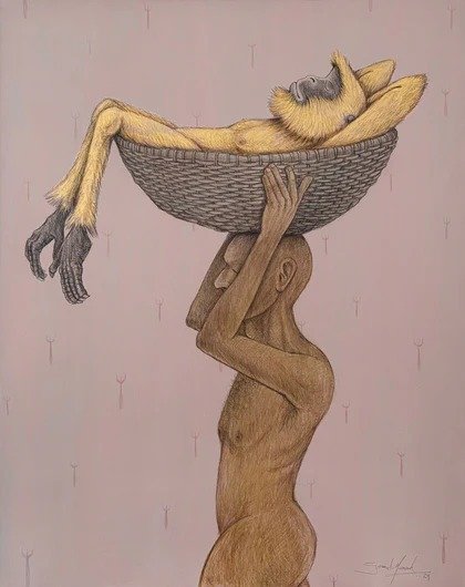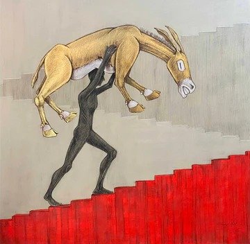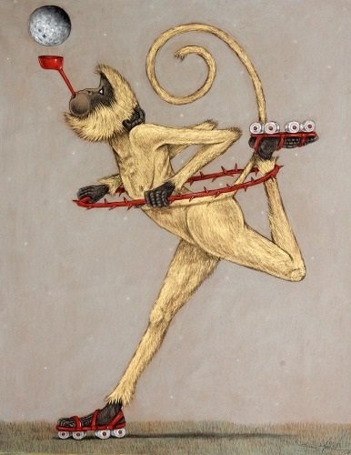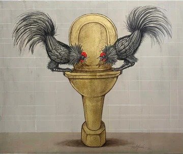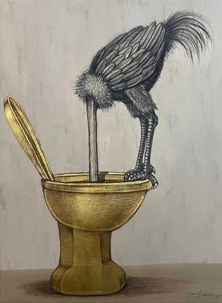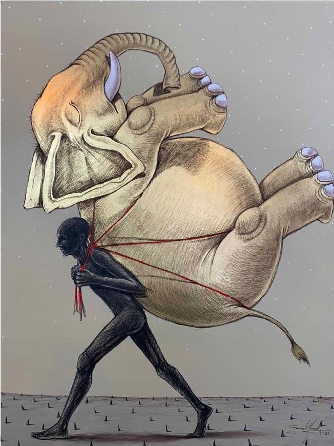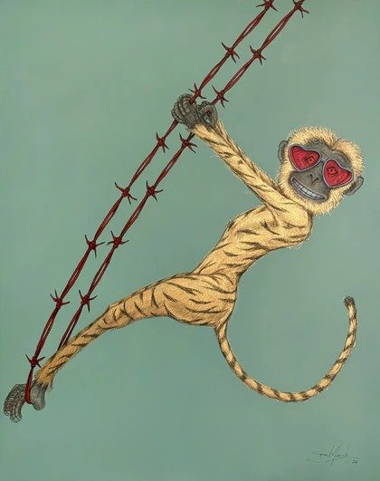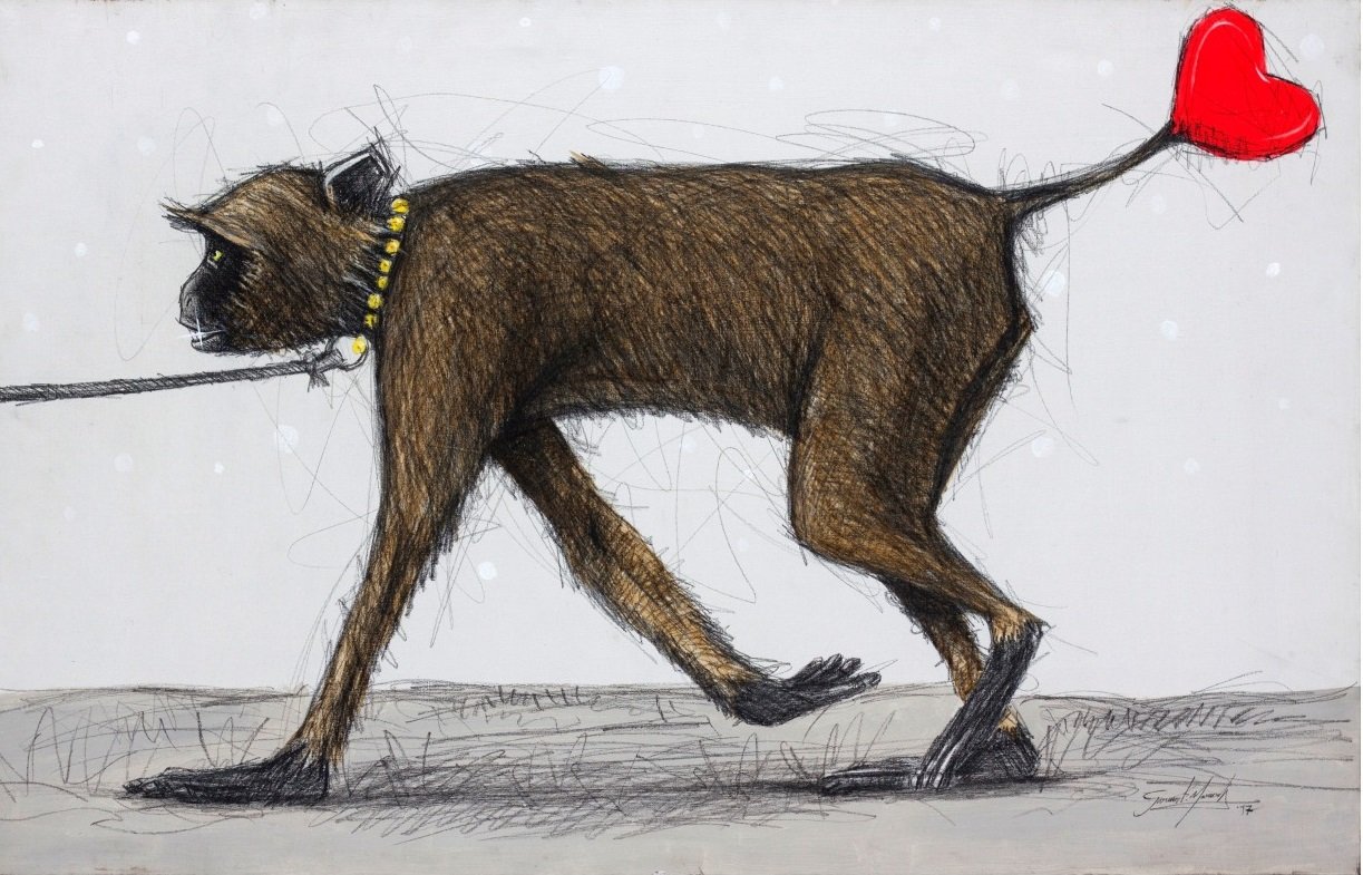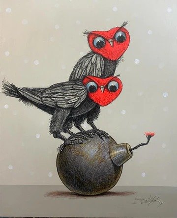 They are his own deeply felt emotions based on his experiences. “The satire inherent in my work serves to resolve my inner conflicts,” says Marwah. In his work, serious contemplations have been dealt with certain lightness. The images are rendered in a way to make them easy on the eye. Marwah’s use of red makes the dominant idea of the art even more noticeable but the visuals are easy on the eye. Serious observations and thoughts have been laid down with assured lightness.
