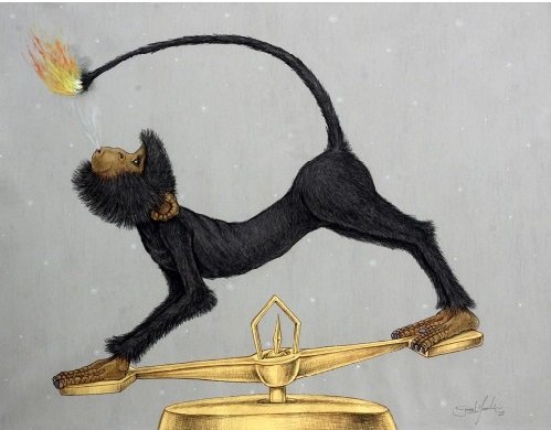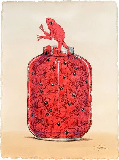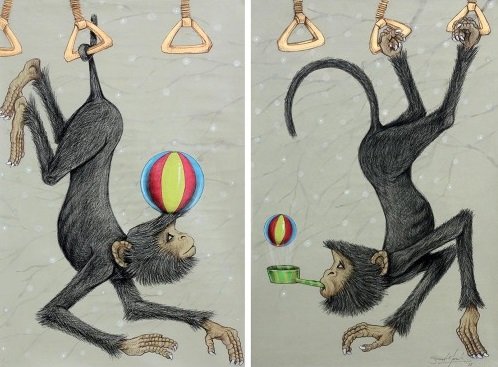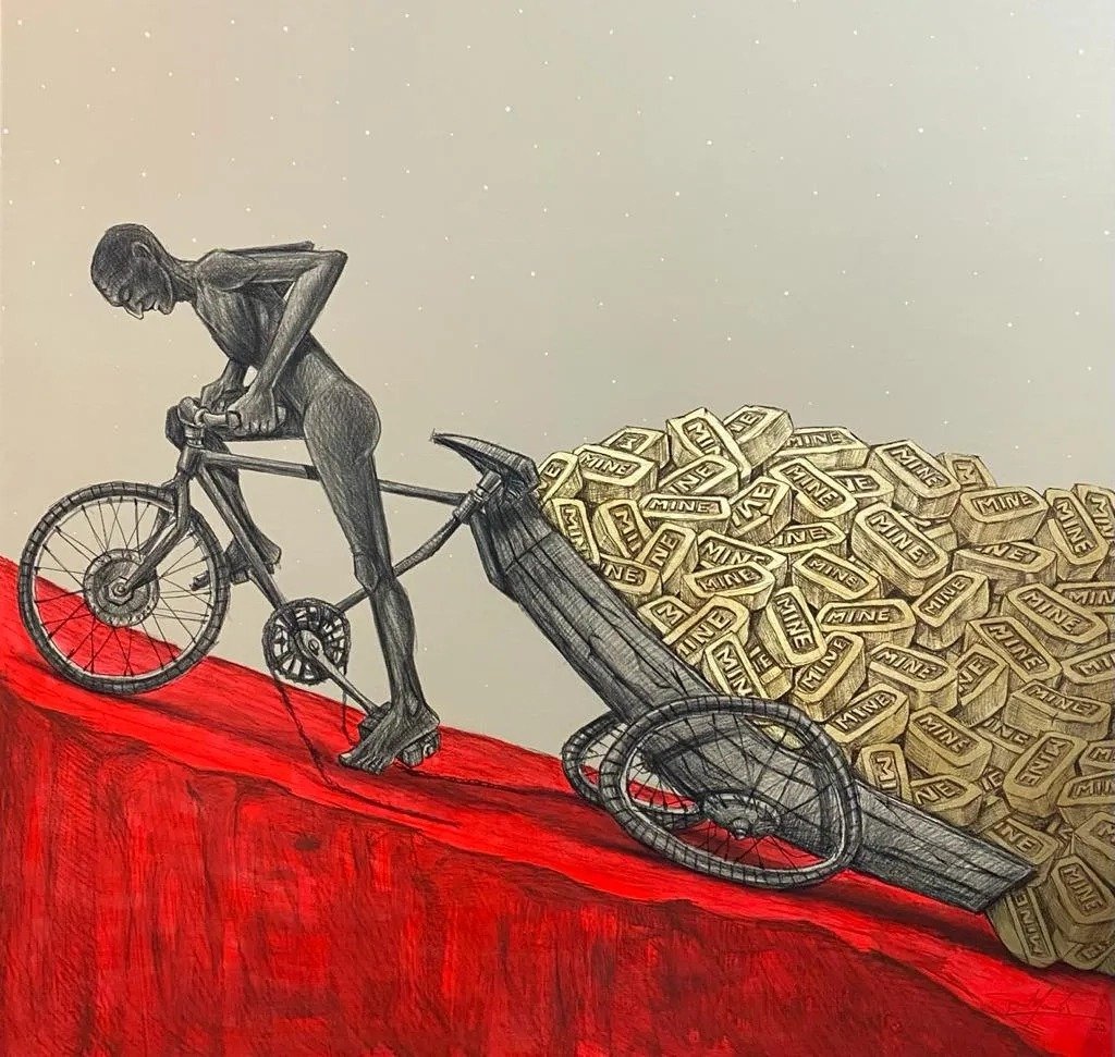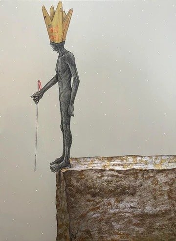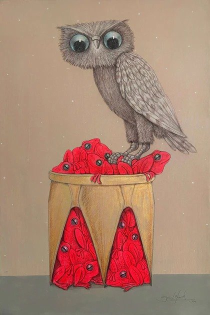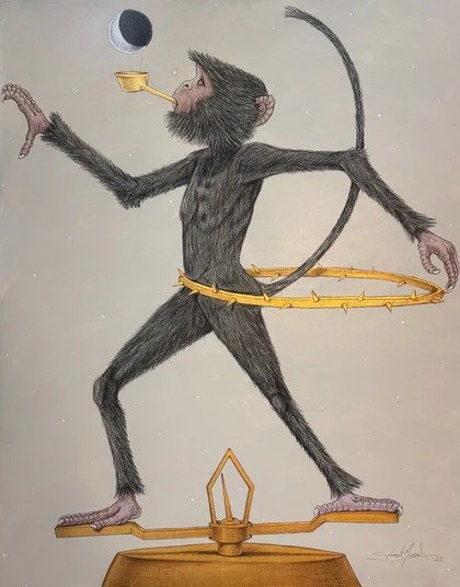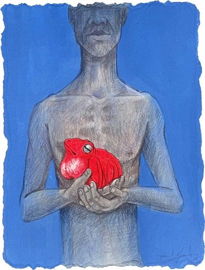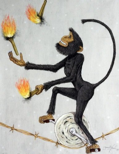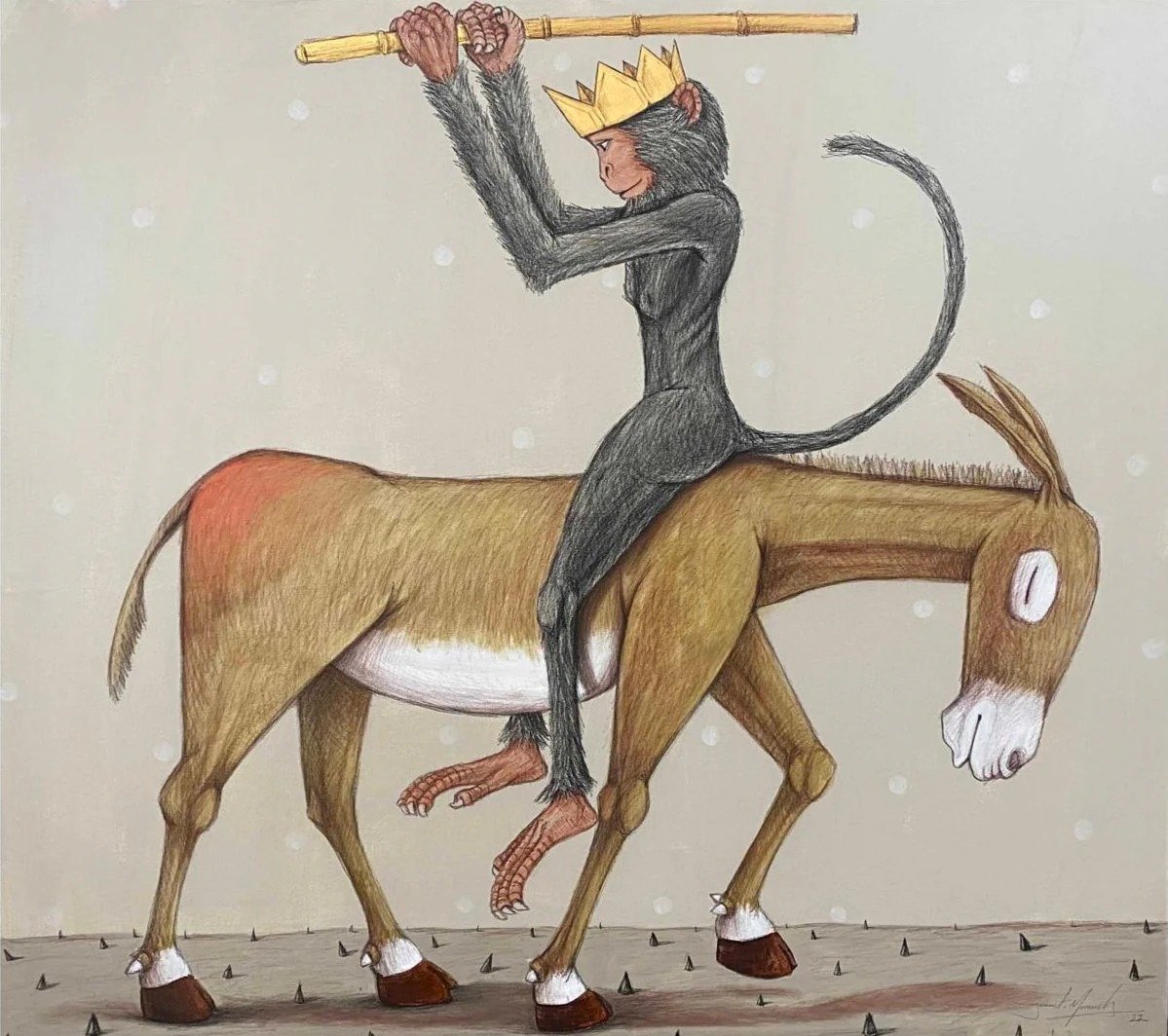 They are his own deeply felt emotions based on his experiences. “The satire inherent in my work serves to resolve my inner conflicts,” says Marwah. In his work, serious contemplations have been dealt with certain lightness. The images are rendered in a way to make them easy on the eye. Marwah’s use of red makes the dominant idea of the art even more noticeable but the visuals are easy on the eye. Serious observations and thoughts have been laid down with assured lightness.