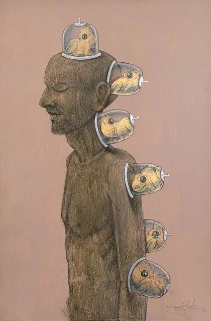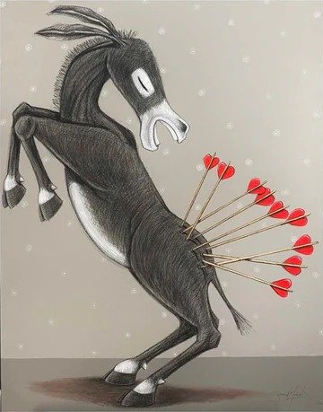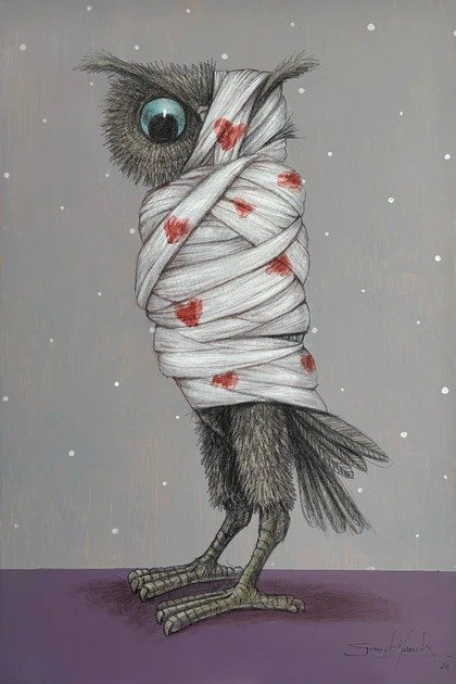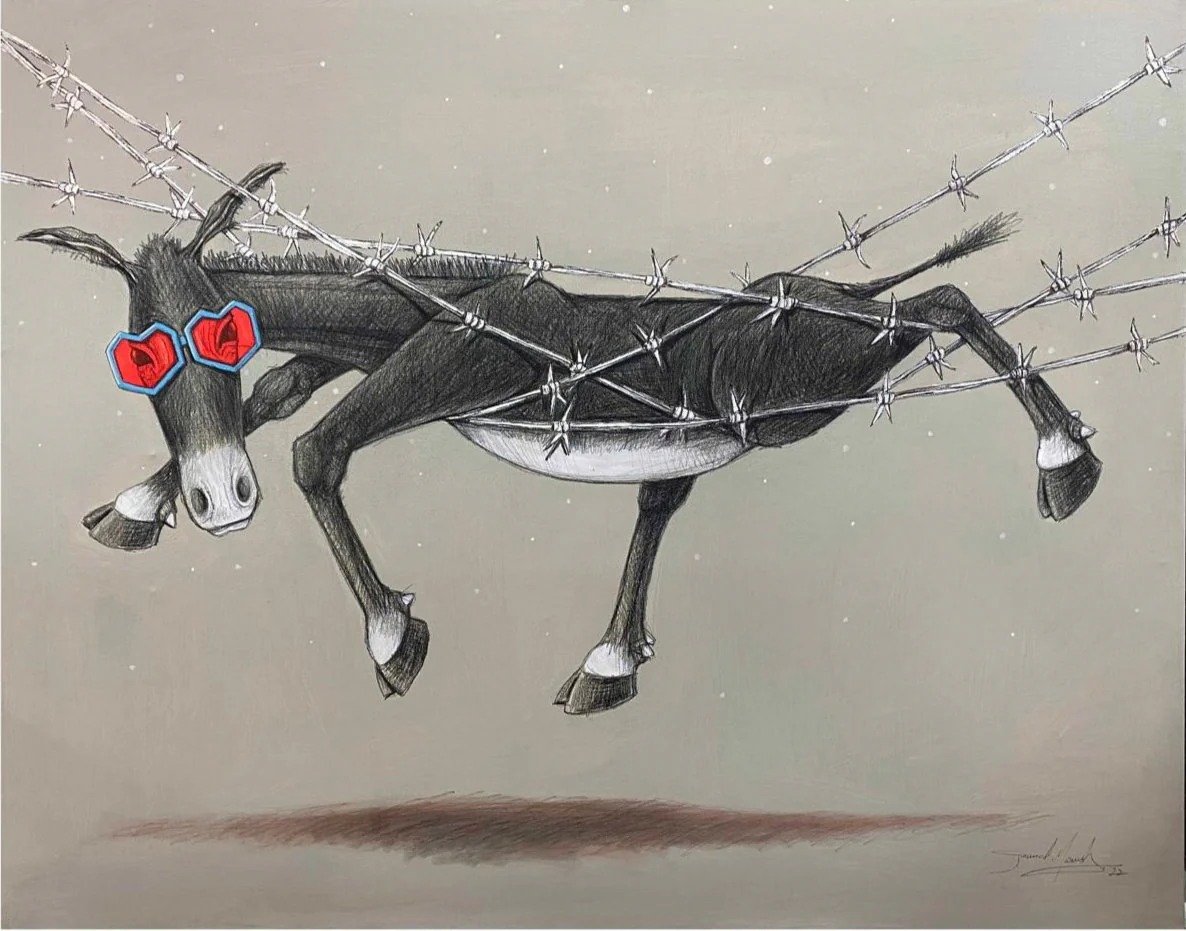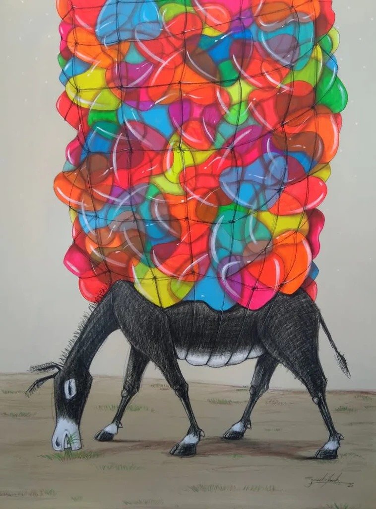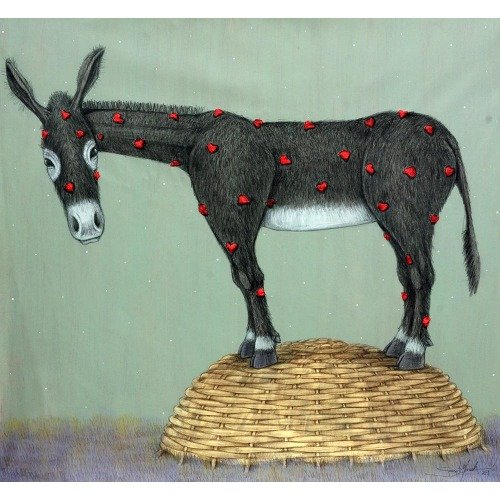 “I use animals as symbols, as well as containers of emotive content. The image of the unassuming cow becomes a spectacle while its lies feeding off waste generated by society. Similarly, people use the image of Gandhiji everywhere, without fully understanding or following his values. The donkey represents obstinacy against odds,” he says. You have other animals like the wise owl that symbolises legacy. The heart snared in jars and soda-bottles, calls for many visual inferences.” Marwah tells us.