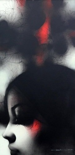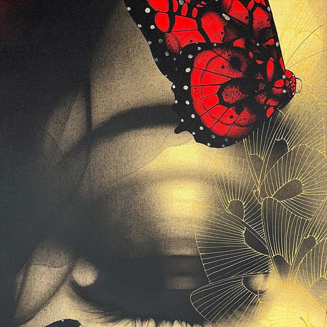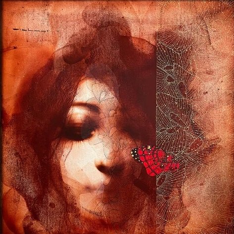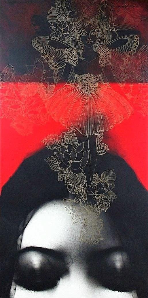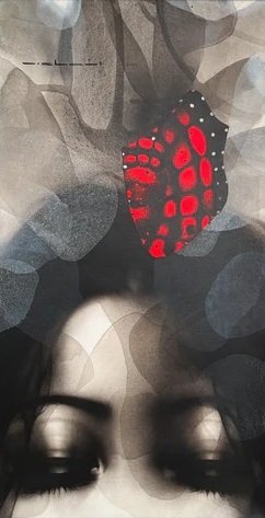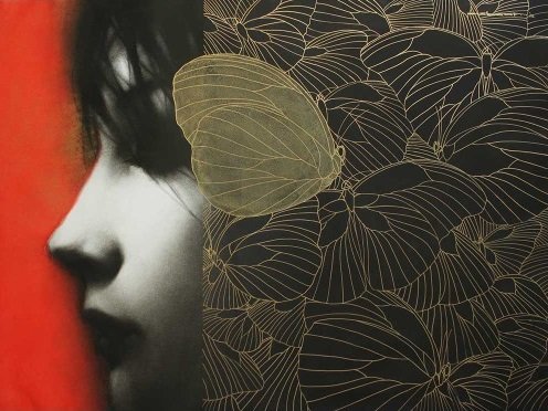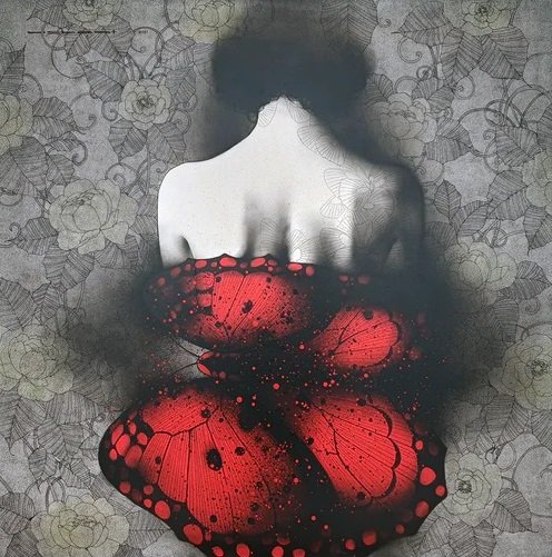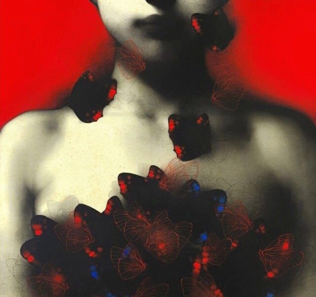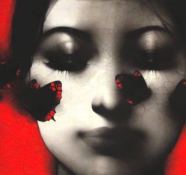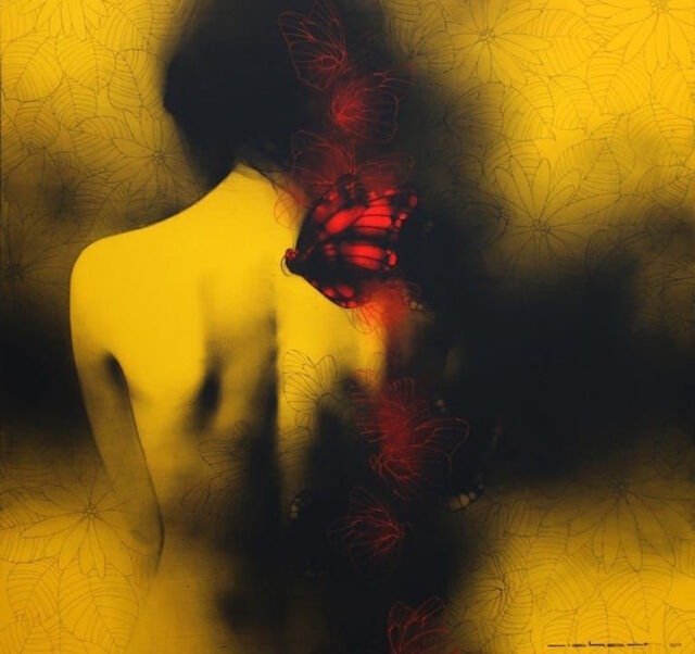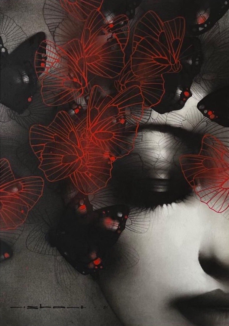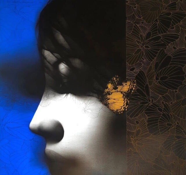 Artist, Nishant Dange take us into dreamscapes featuring otherworldly women, deep in reverie. Interwoven with intricate motifs of butterflies and birds, the mysterious and ethereal women in his art works celebrate the beauty and strength of the feminine. The omnipresent butterfly is a metaphor for the transformative and regenerative power that women possess. Dange uses a blend of charcoal, watercolours and acrylic, to create his moody, atmospheric mixed media works. Nishant Dange depicts ethereal female figures using dark charcoal and contrasting colours that add a sense of drama. He often implements butterflies and birds using fine meticulous lines.