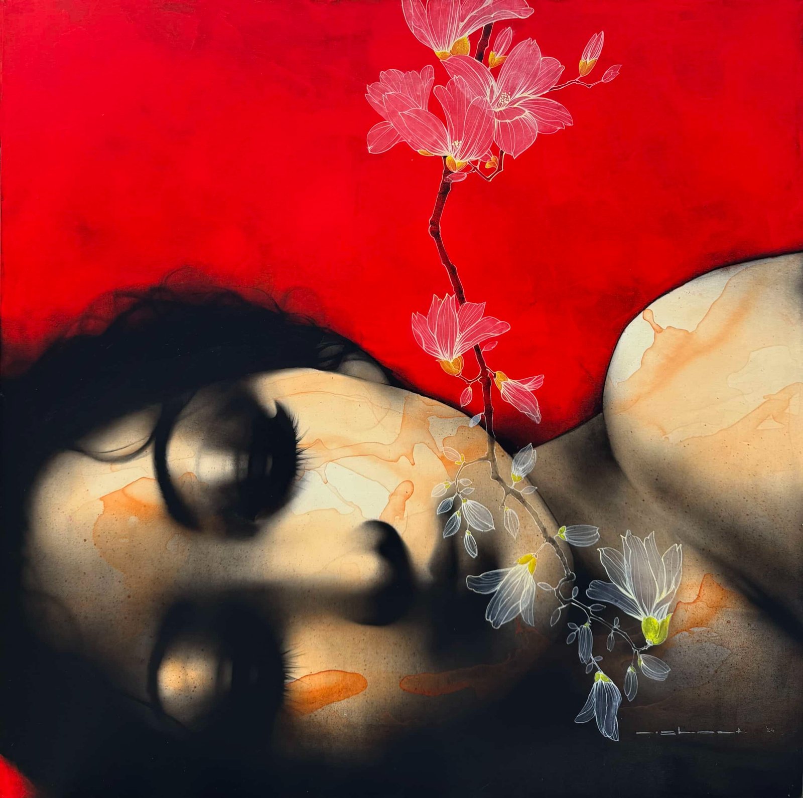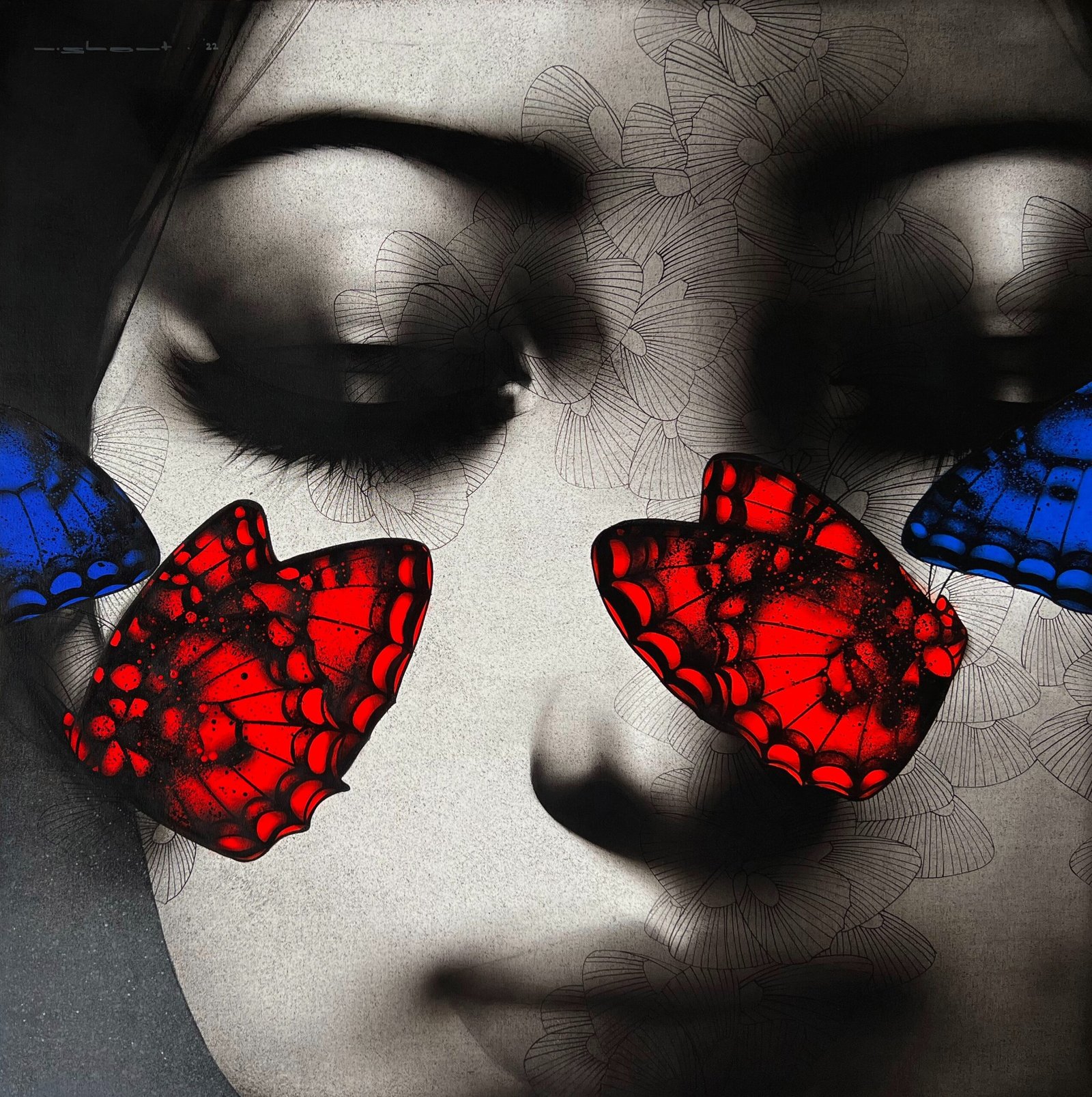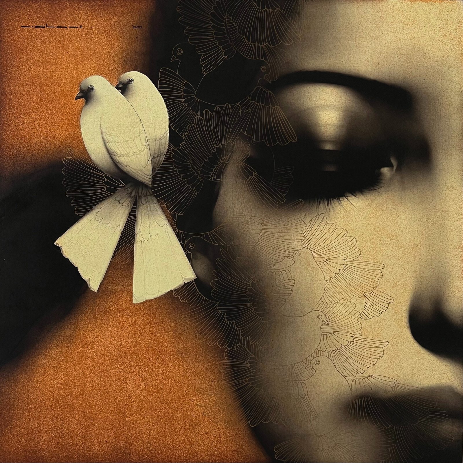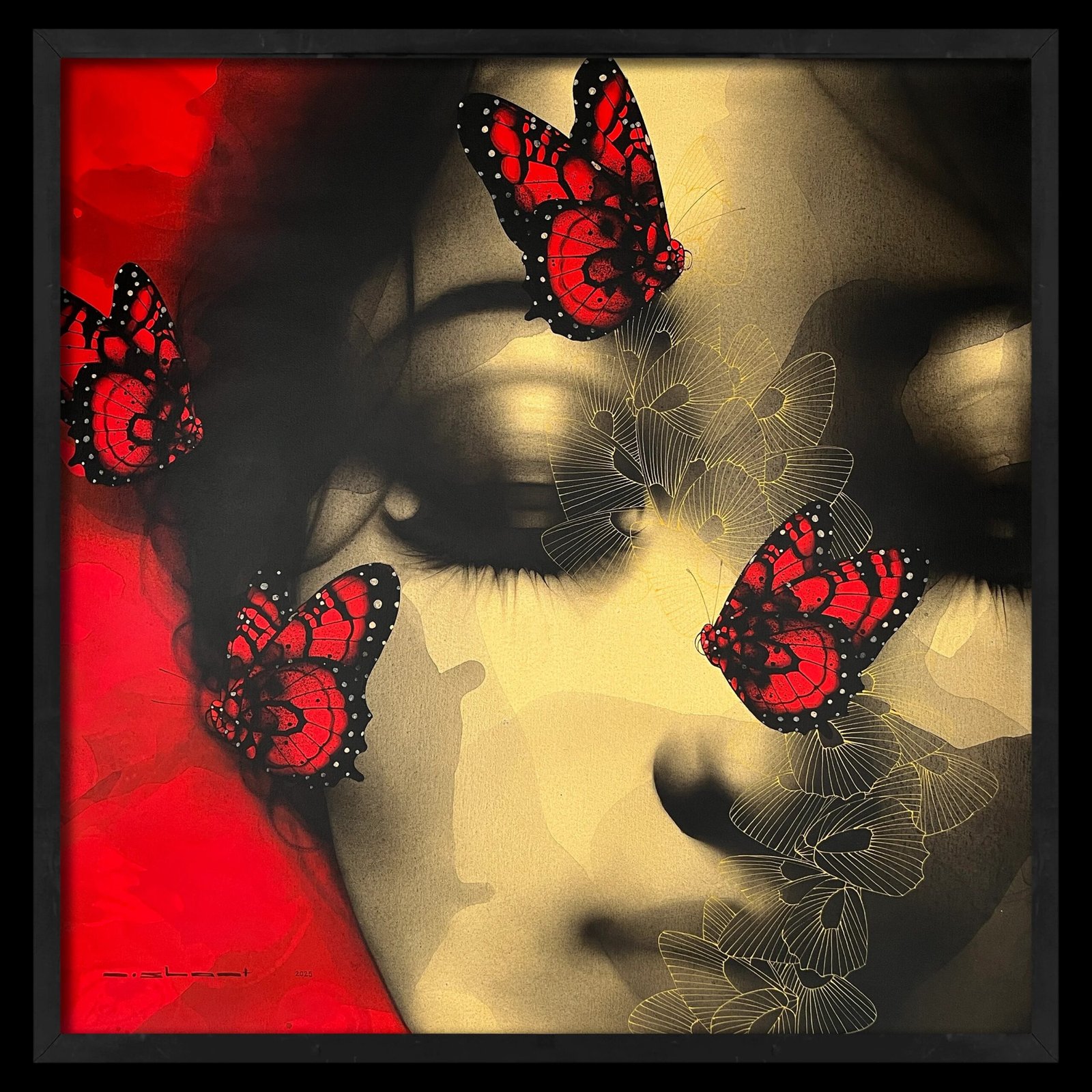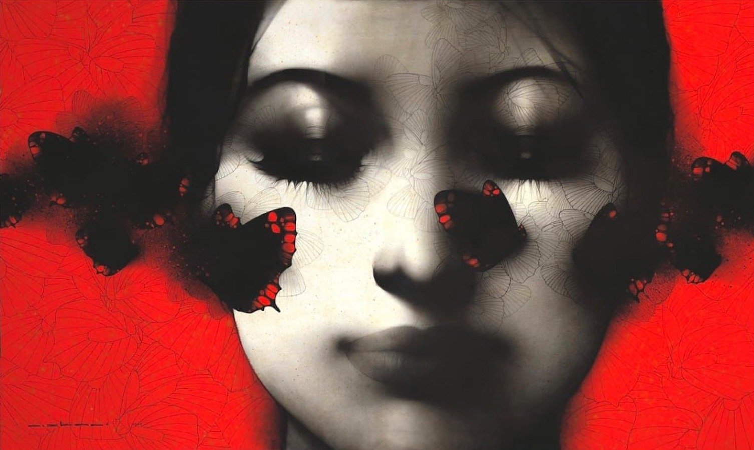 Artist, Nishant Dange take us into dreamscapes featuring otherworldly women, deep in reverie. Interwoven with intricate motifs of butterflies and birds, the mysterious and ethereal women in his art works celebrate the beauty and strength of the feminine. The omnipresent butterfly is a metaphor for the transformative and regenerative power that women possess. Dange uses a blend of charcoal, watercolours and acrylic, to create his moody, atmospheric mixed media works. Nishant Dange depicts ethereal female figures using dark charcoal and contrasting colours that add a sense of drama. He often implements butterflies and birds using fine meticulous lines.