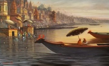 Deeply engrossed by Banaras, Paramesh often uses Ganga Ghats as the background of his paintings. His art has numerous layers that resonate with the different layers and secrets held by the holy city. These layers comprising of temples and mountains add depth to the artwork and give the audience a new perspective towards these paintings. The artist colors his paintings with rustic tones of yellow, red, green, and blue. The simplicity in Paramesh’s paintings reflect the simplicity of the easily flowing river Ganga.