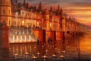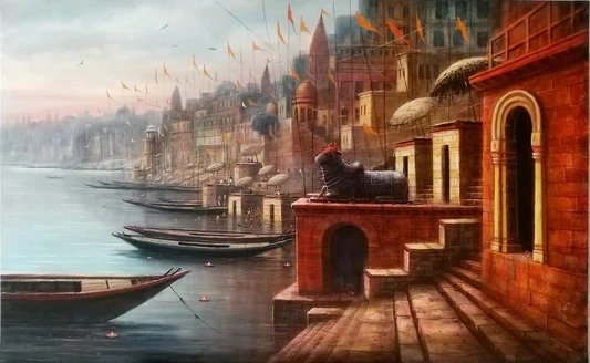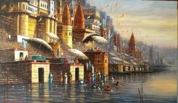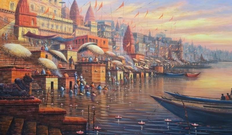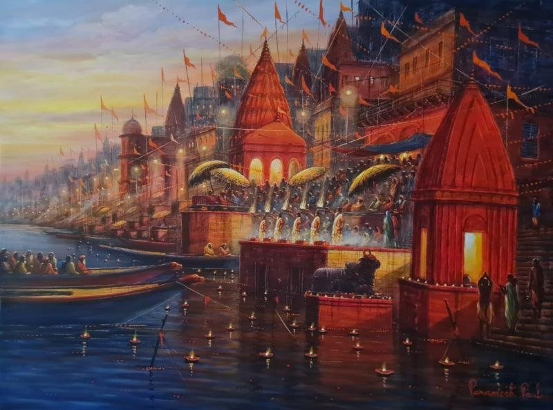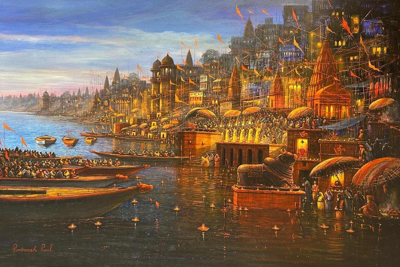 As an artist, Paramesh would always gravitate towards the stories from Hindu mythology and ancient Indian cities, holy cities. He recreates these cities and stories on his canvas and fills colors in this beautiful blend of his imagination and reality.