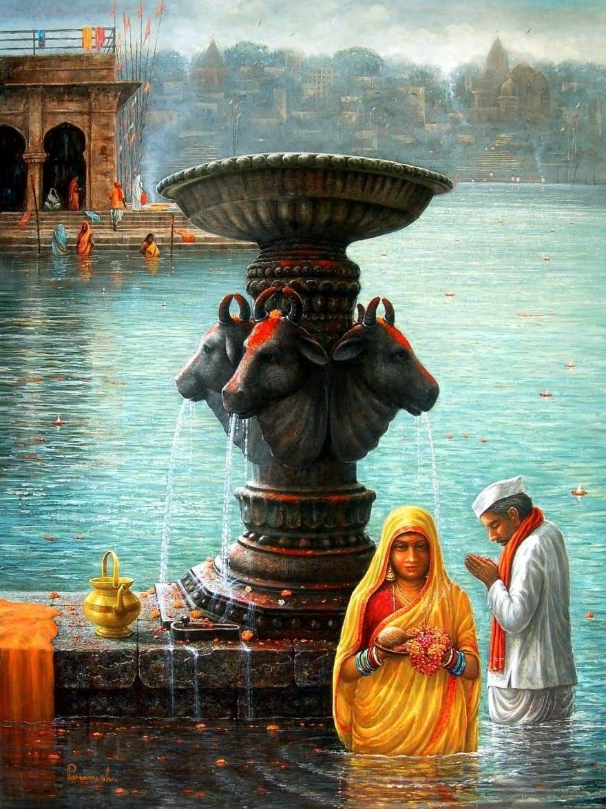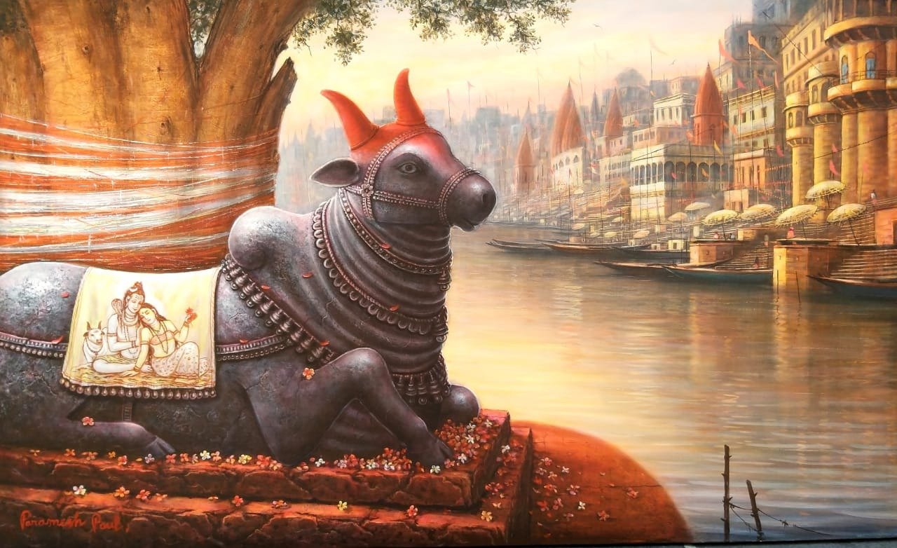 Shiva and His vehicle Nandi, form an important part of these paintings, with Ganga in the background, onlookers could often see worshipers offering their prayers to Shiva. The reflection of these visitors in the river, echos with how people often reflect on their lives and deeds while visiting Banaras. Through his art, Paramesh seamlessly narrates the stories about the place and the events to his viewers. Over the past few years, Paramesh has exhibited his work at many shows and has managed to create a place for himself in national and international art circles.