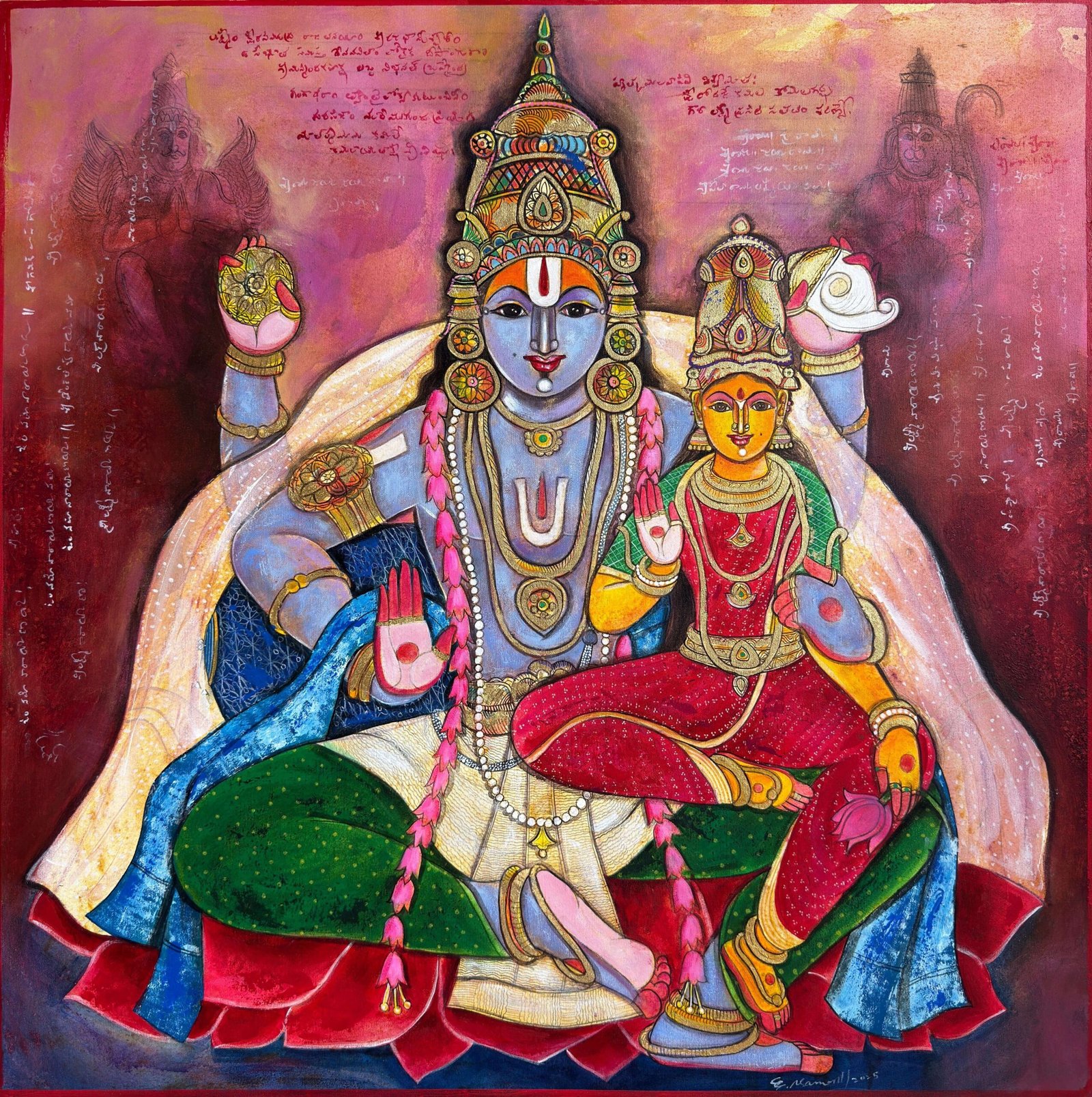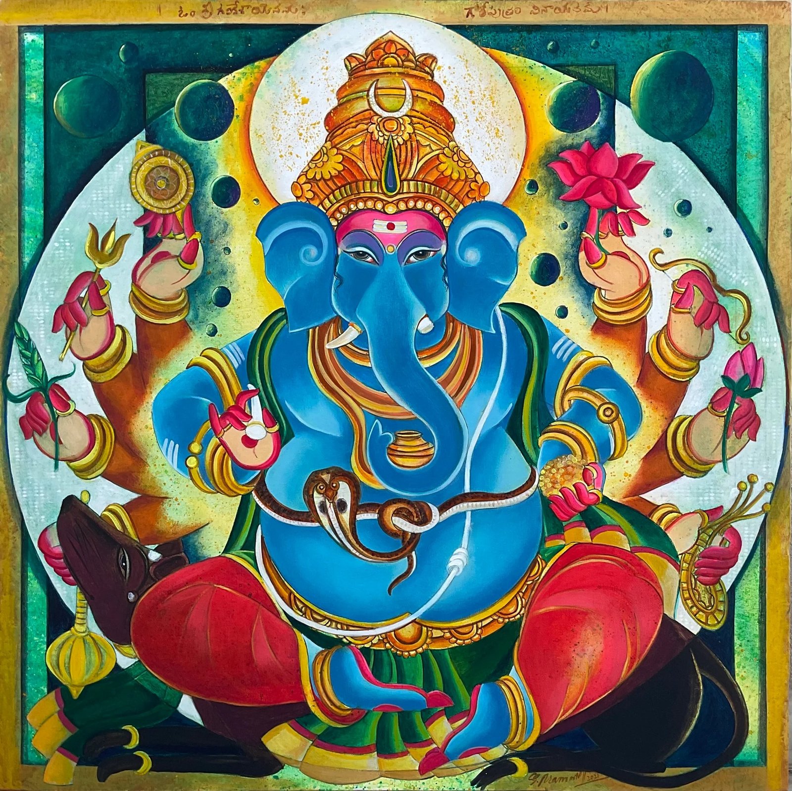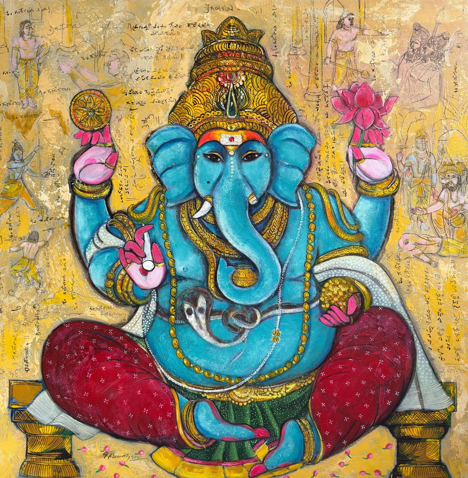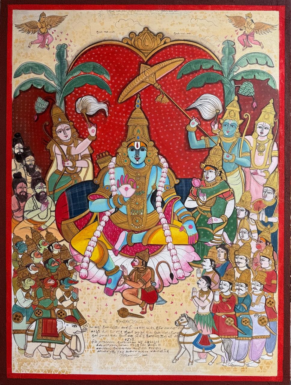 Artist, Pramod Reddy Gade is a trained mural artist. He is prolific and sensitive in his approach to painting. His interest and devotion to Hindu religious iconography has influenced his work. There is a story to every painting Gade depicts in his work. The essence of these stories reveal in his work as layers that narrate episodes of myth associated to Hindu religion. His belief in the universal divinity as supreme power manifests by romanticizing the various episodes of the epic Ramayana and Mahabharata. Gade’s use of vibrant acrylics on canvas portray the divine grace that he attempts to express. The use of text and image in his work refers to the ancient manuscripts that adorn the Indian historical traditional Art. Pramod Reddy received his BFA in Painting from Jawaharlal Nehru Technological University, Hyderabad and his MFA in Mural from M.S. University, Baroda. He has exhibited widely across the globe.