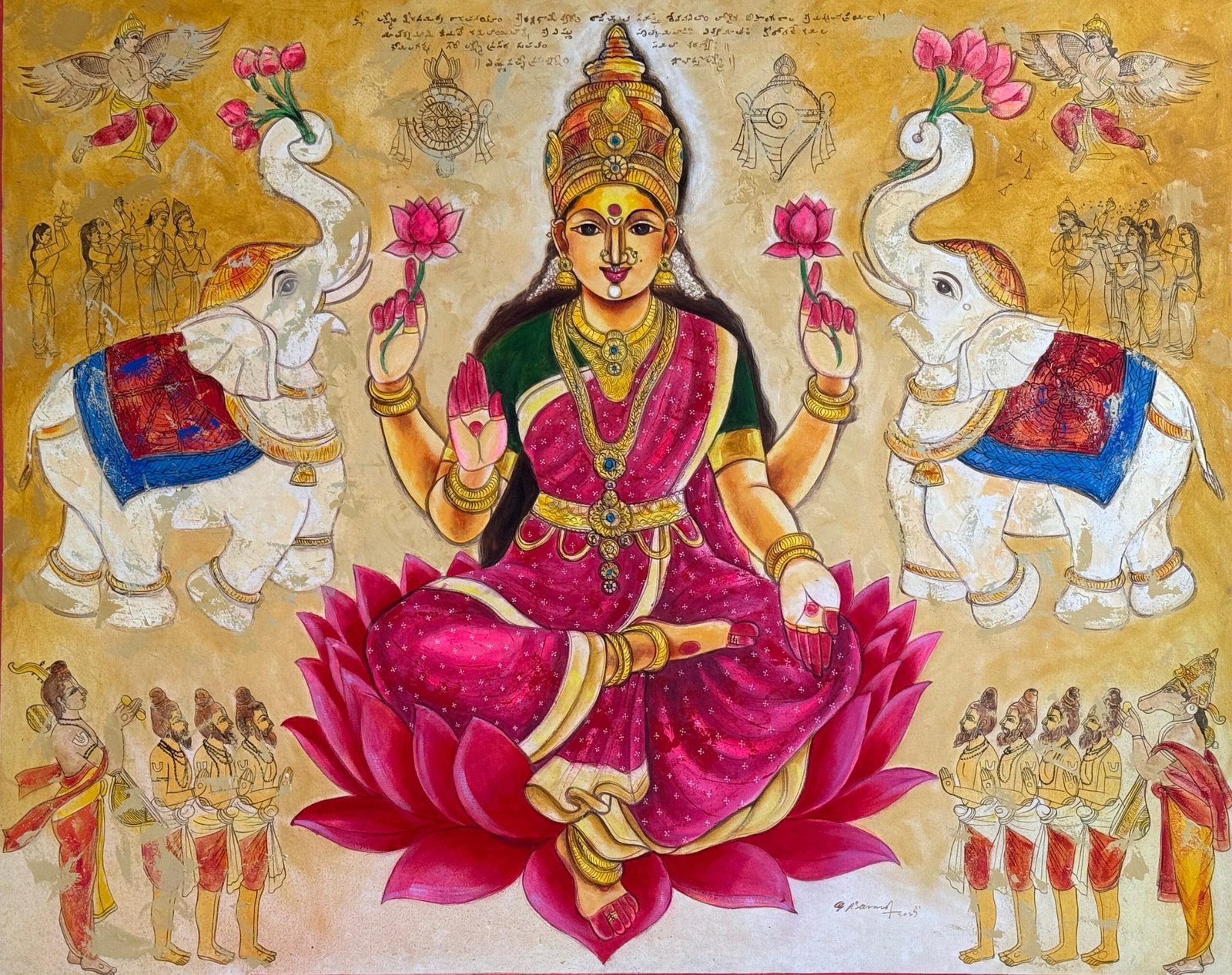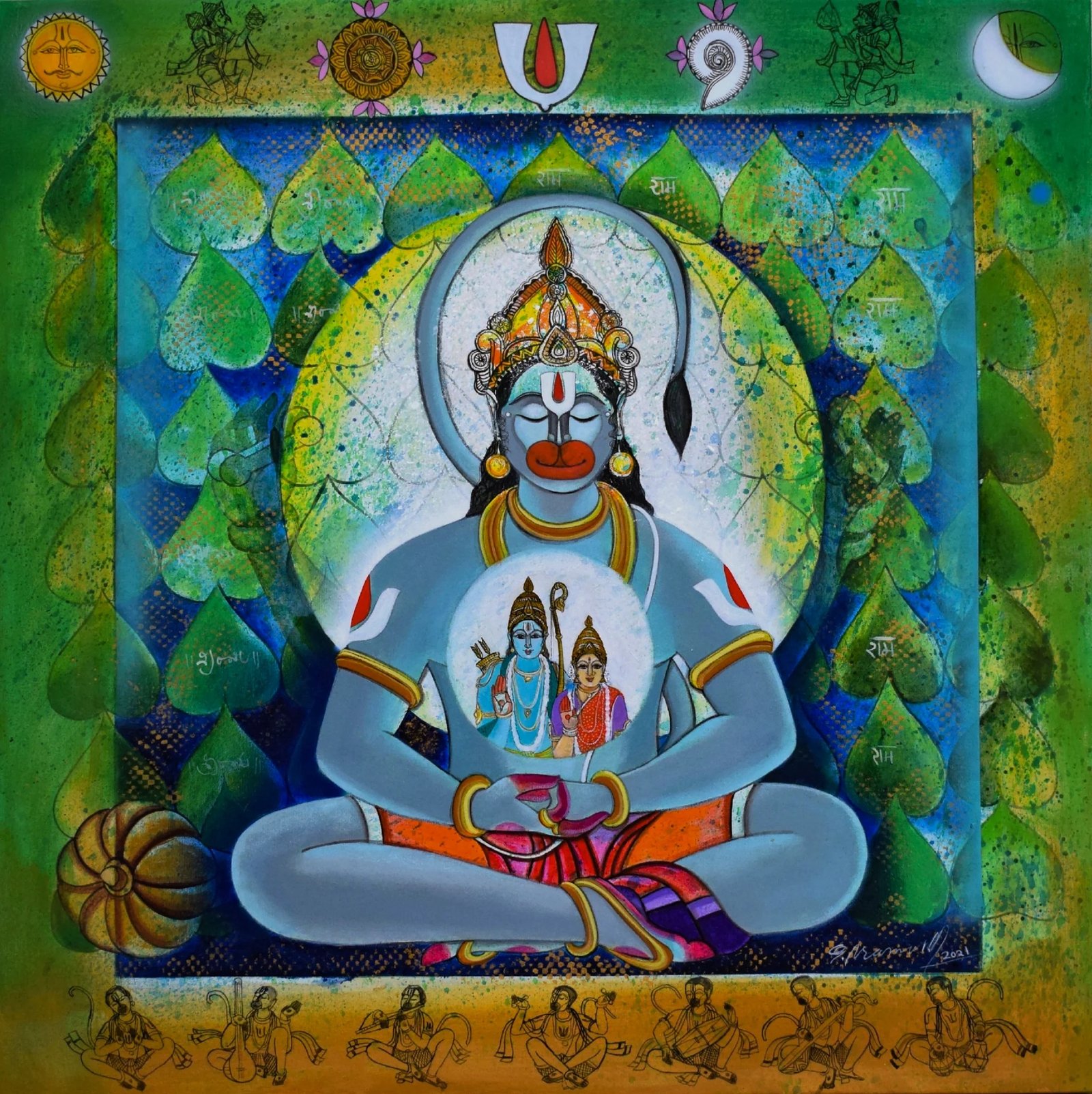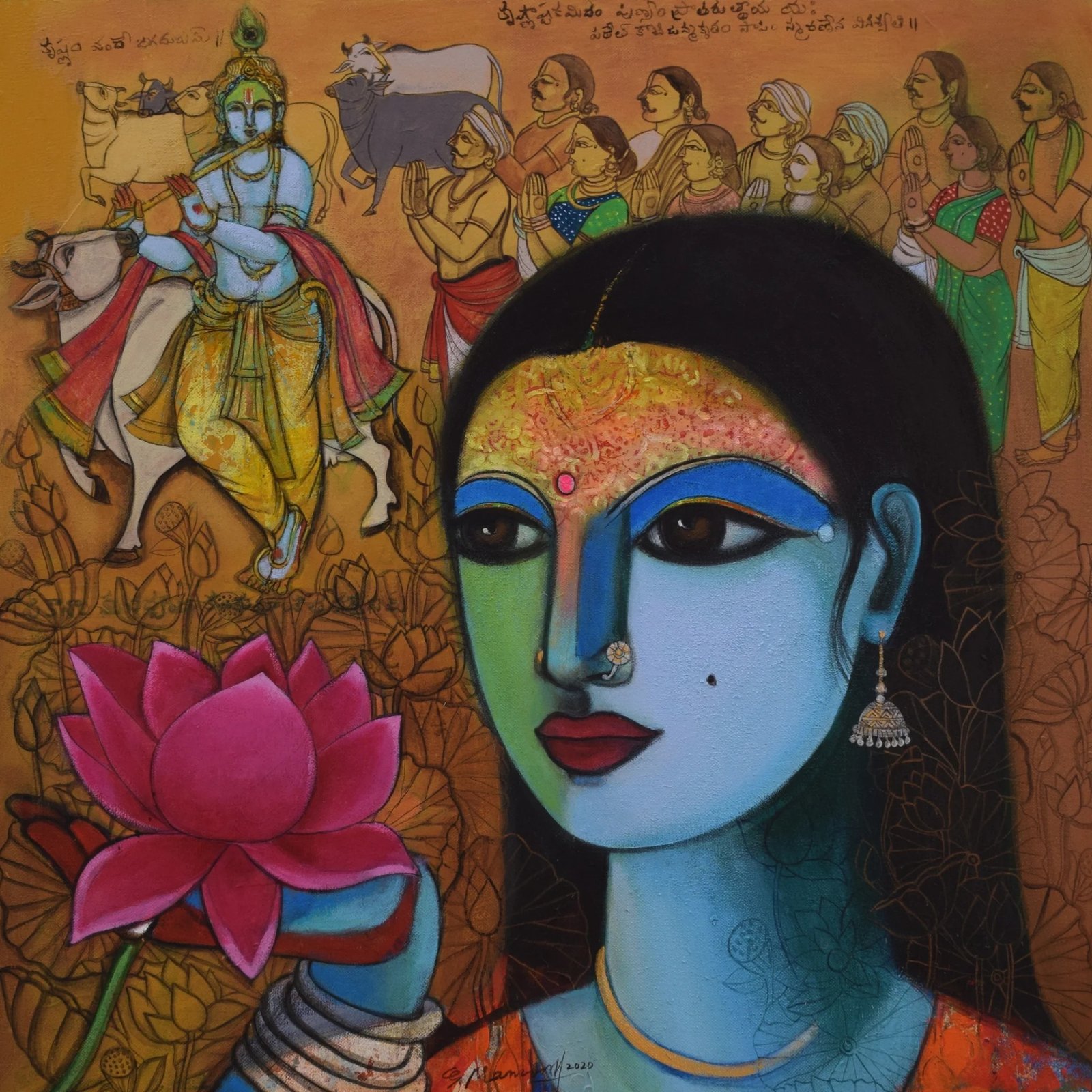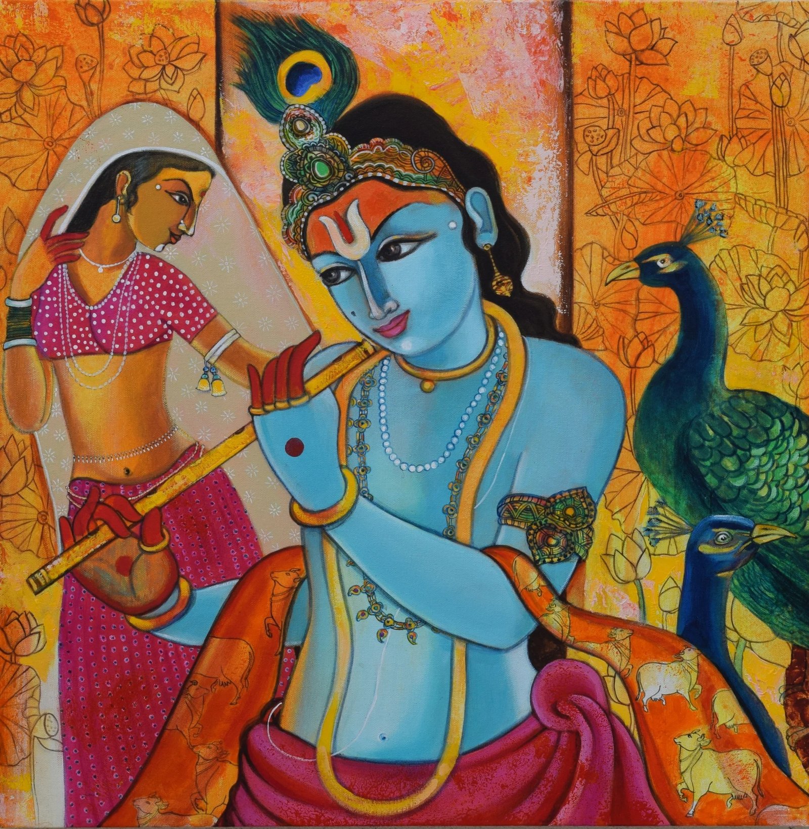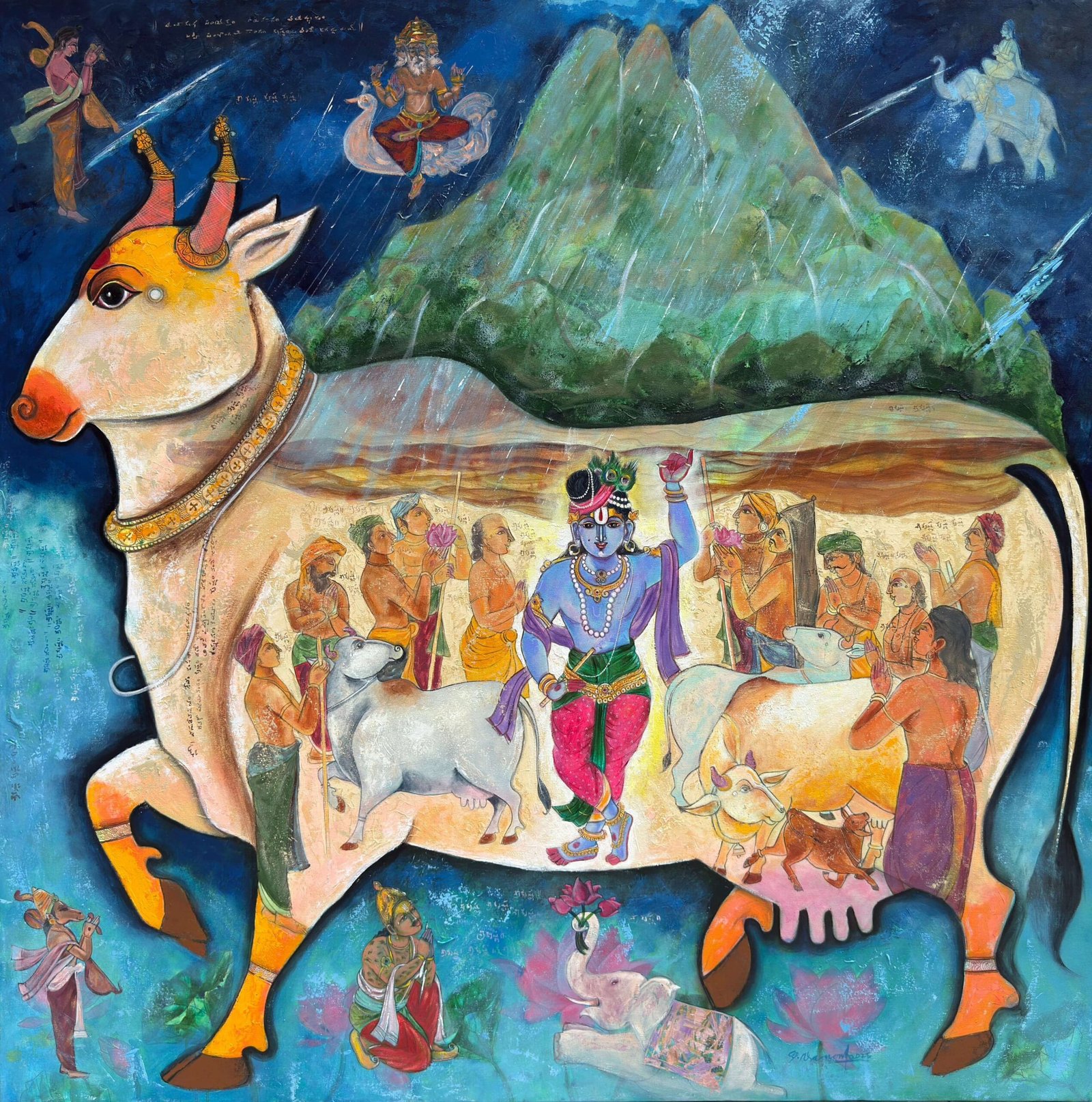 Artist, Pramod Reddy Gade is a trained mural artist. He is prolific and sensitive in his approach to painting. His interest and devotion to Hindu religious iconography has influenced his work. There is a story to every painting Gade depicts in his work. The essence of these stories reveal in his work as layers that narrate episodes of myth associated to Hindu religion. His belief in the universal divinity as supreme power manifests by romanticizing the various episodes of the epic Ramayana and Mahabharata. Gade’s use of vibrant acrylics on canvas portray the divine grace that he attempts to express. The use of text and image in his work refers to the ancient manuscripts that adorn the Indian historical traditional Art. Pramod Reddy received his BFA in Painting from Jawaharlal Nehru Technological University, Hyderabad and his MFA in Mural from M.S. University, Baroda. He has exhibited widely across the globe.