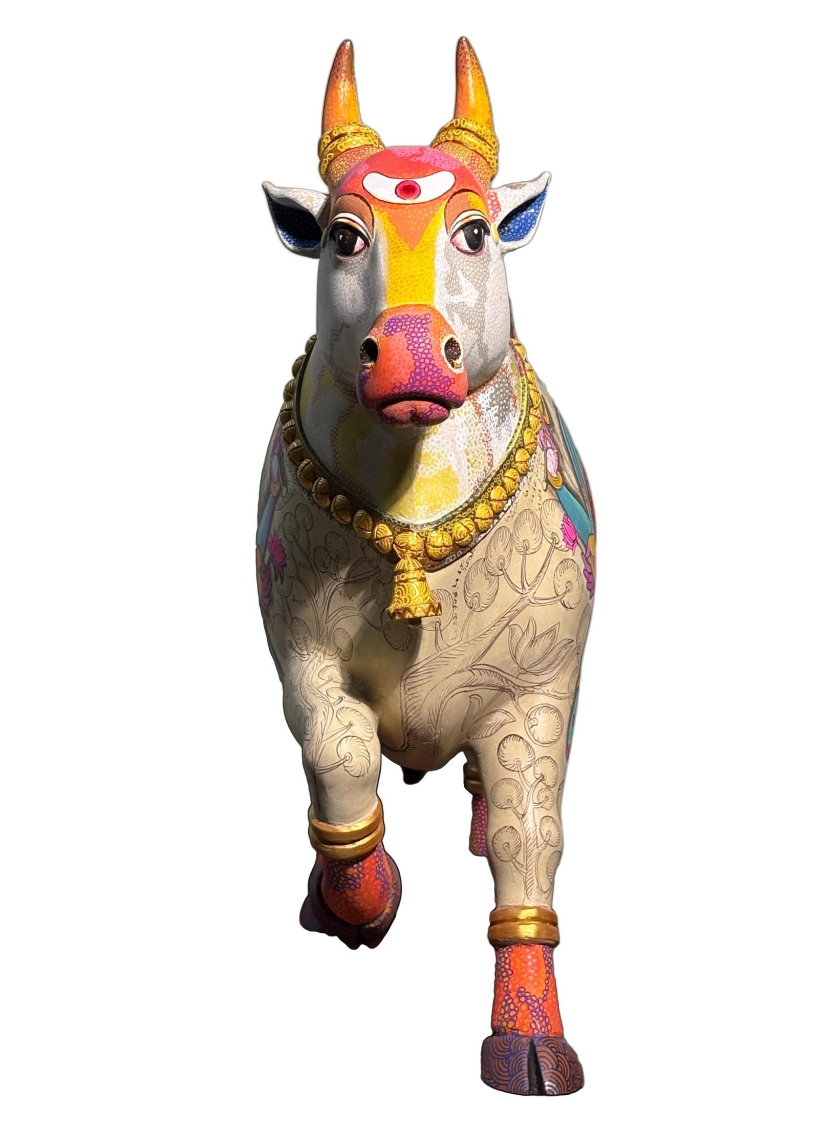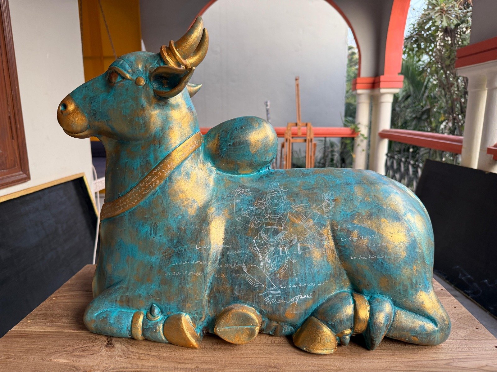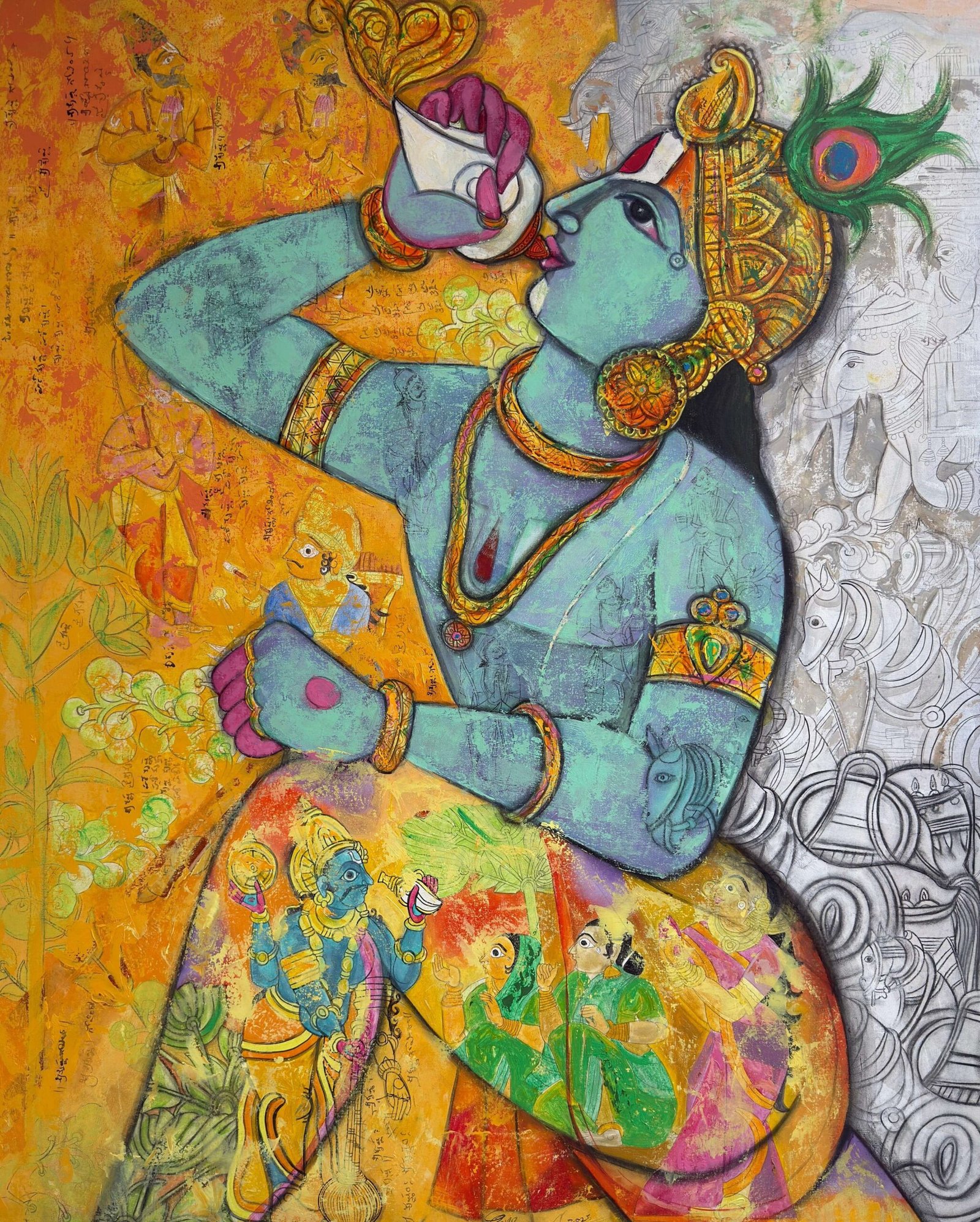 “My works is influenced by Hindu mythology and the tales associated with its stories. I embark on a style that I developed while I was studying mural in my master’s degree. This style adopts working in layers that metaphorically represent the episodes in the stories. The transparent layers revealing the elements of the events juxtapose with text and image, which plays a dominating part in my work. The bright traditional use of colours ref the nature of the mythological depictions in the In art. Line to me is my strength through which I express my inner feeling of aesthetics.” shares the Artist.
