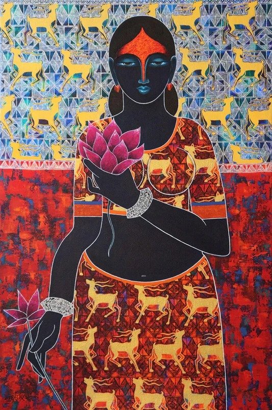 Artist Pratiksha Bothe’s journey in art field began as a “Graphic Designer” with an advertising agency. She started thinking about sensitivity and intent of the paintings… She have studied in Indology, about the history and cultures, languages, and literature of the Indian subcontinent…the blend of Indian culture & History indirectly flowed in my paintings. Sensitive and full of color, her paintings are a reflection of her mind. She paints religious stories, decorative motifs, symbols etc in her own way.