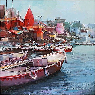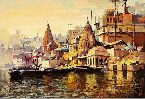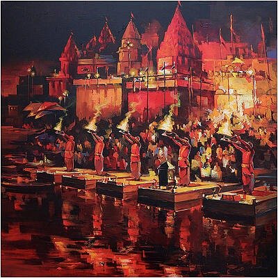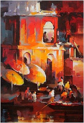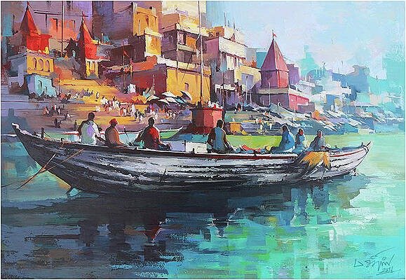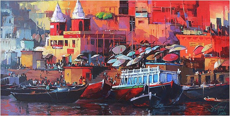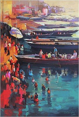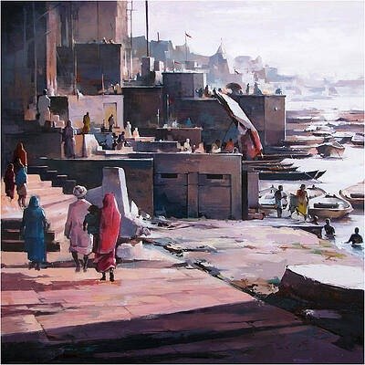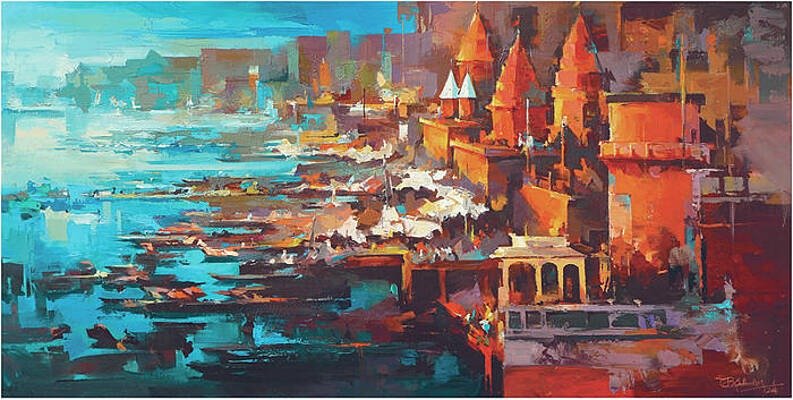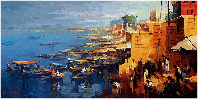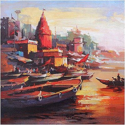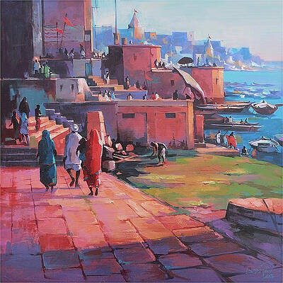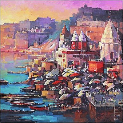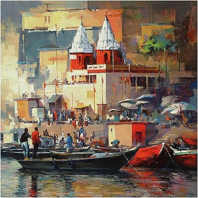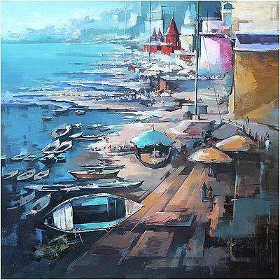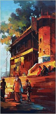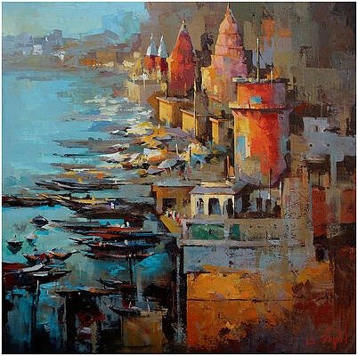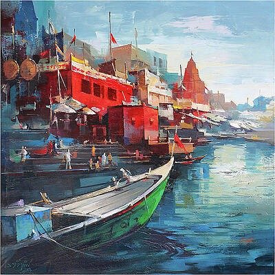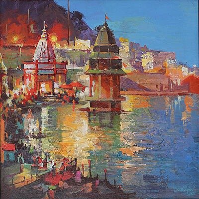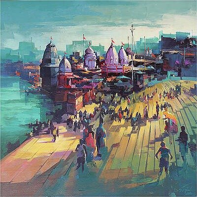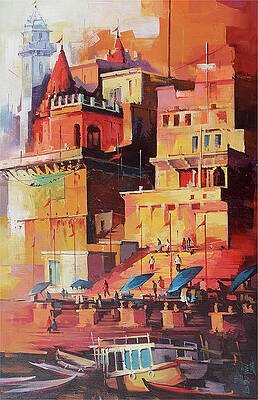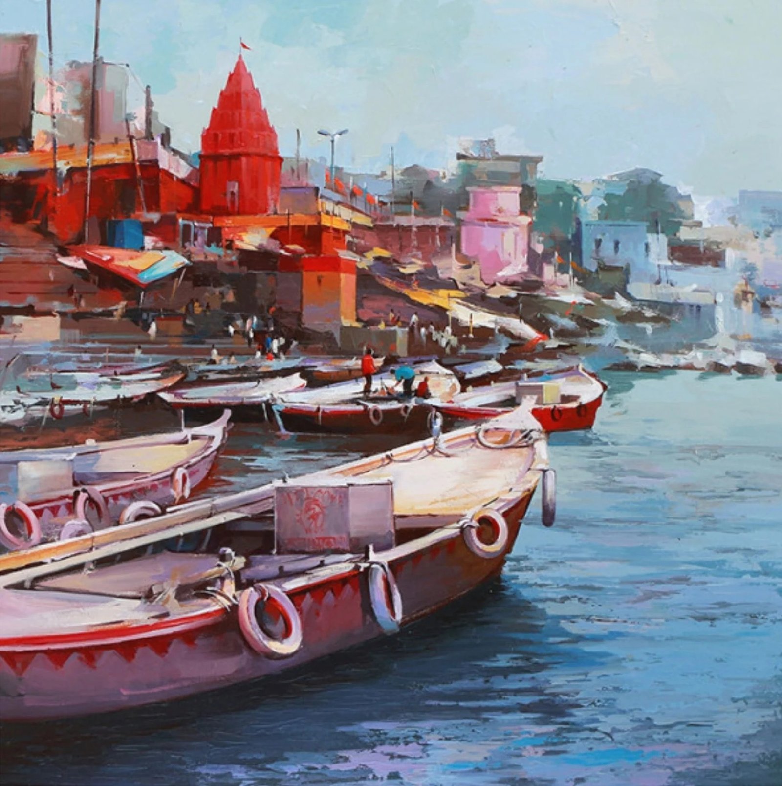 A significant thread within his oeuvre is his long engagement with the ghats of Varanasi, a subject he has revisited over several years. These works move beyond topographical depiction, instead capturing the layered rhythms, light, and spiritual intensity of the riverfront. Kanna’s compositions often balance architectural structure with atmospheric nuance, where built forms dissolve into light, reflection, and movement. His handling of surface and perspective reveals a quiet discipline, allowing the viewer to experience place not as a static image, but as a lived continuum.